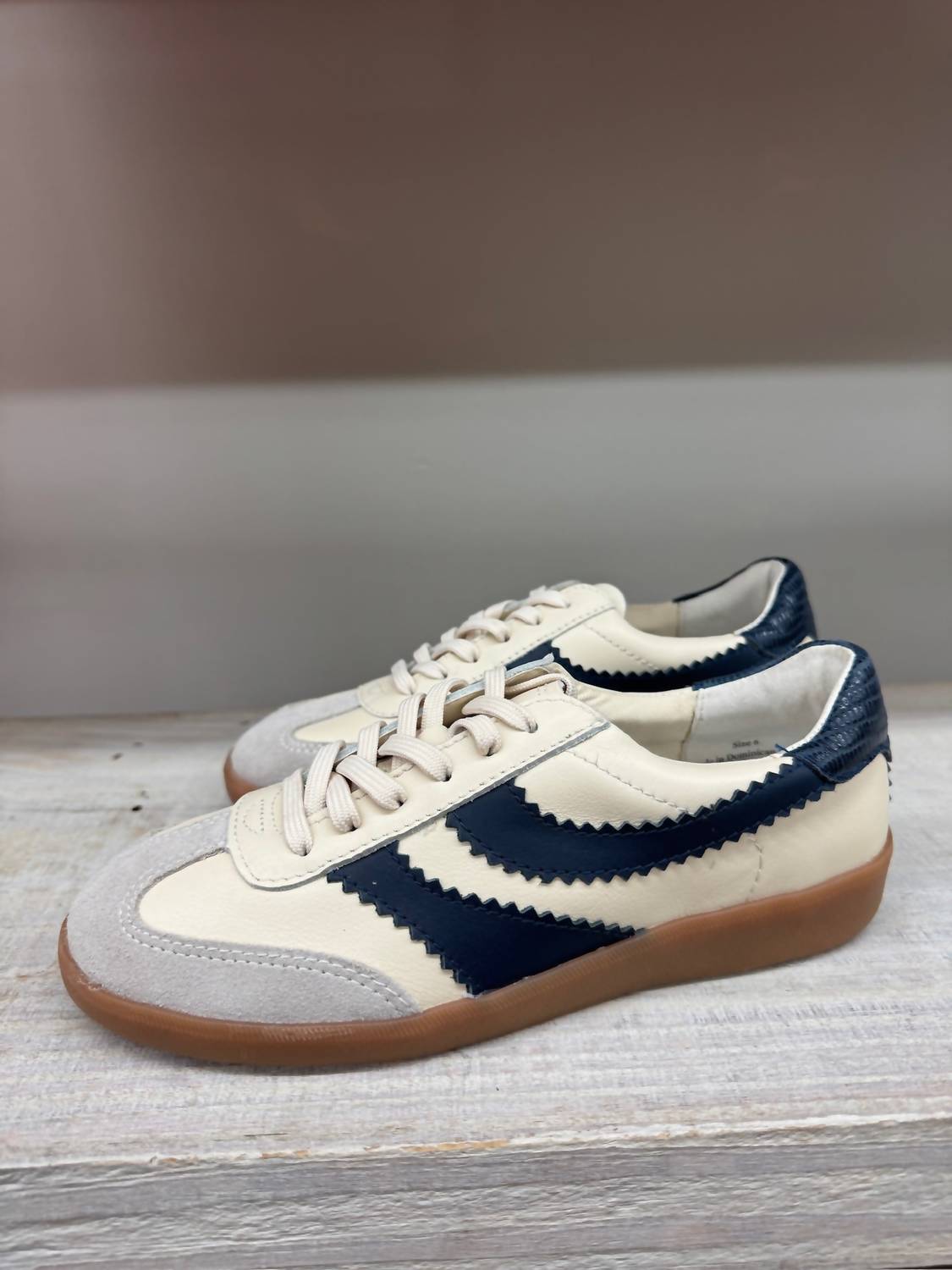 Cute, functional, and comfortable. These sneakers check all the boxes. Introducing the Women's Merit Sneaker by Dolce Vita, a stylish choice for the modern female traveler. This white and navy leather sneaker features a round toe and a flat heel under 1", ideal for both streetwear and spring occasions. The shoe boasts a leather upper, synthetic outsole, textile lining, and synthetic sock, all crafted with quality imported materials. Pair these sneakers with pull-on trousers or dresses for a chic and comfortable look.