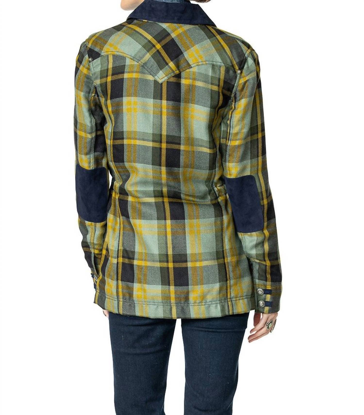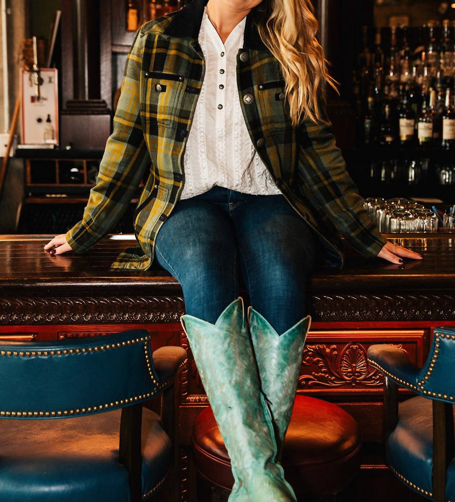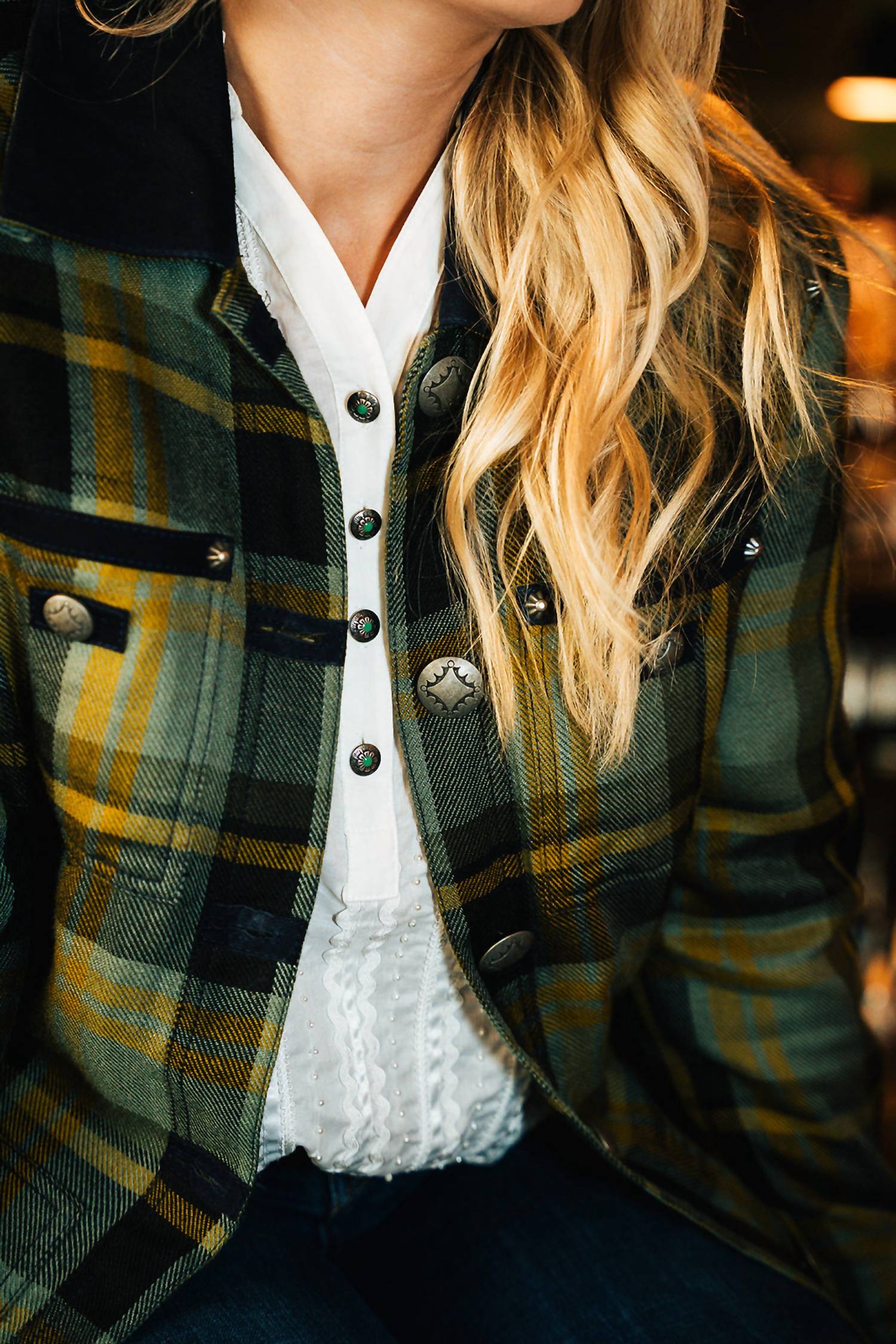 A casual yet cool jacket that every closset needs. Introducing the Rodgers Plaid Jacket by Double D Ranch, a cozy must-have for your collection. This women's casual jacket features long sleeves and is crafted from a blend of 70% viscose and 30% wool. Embellished with a suede collar and trim, stud accents, and concho buttons, it exudes unique style and comfort. Closure: Button closure. Ideal for those seeking style and warmth in the signature blue and green hues of the Taos collection.
