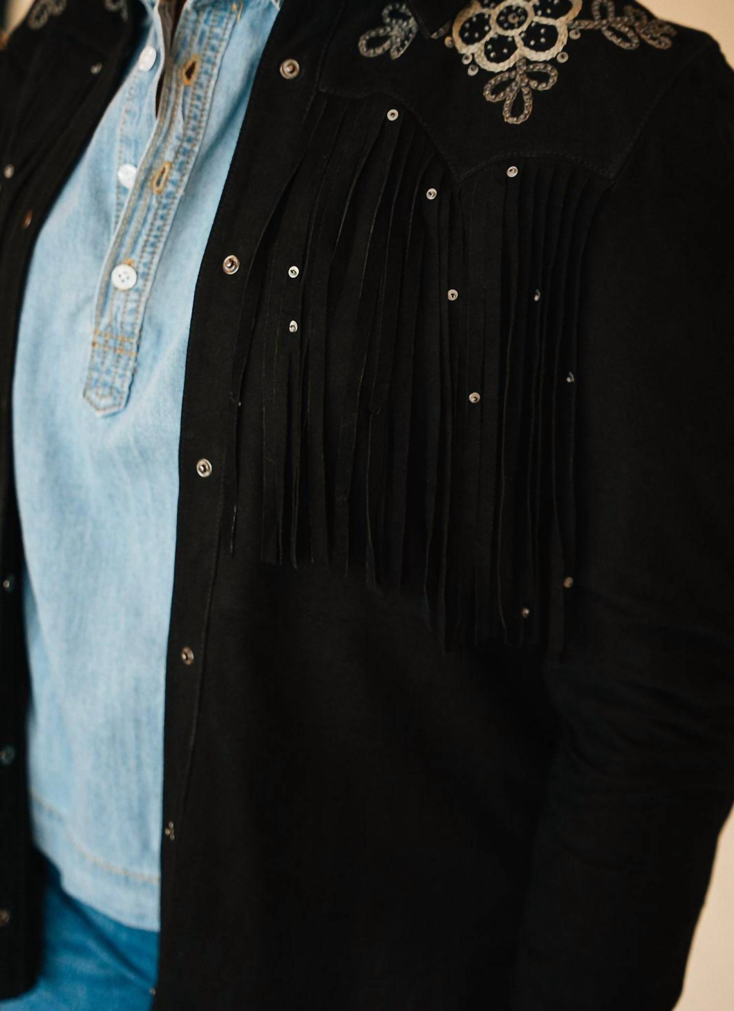 Cute, casual, and comfortable. This jacket is a must have. Introducing the Lockwood Shirt Jacket from the Taos Collection by Double D Ranch, a must-have in striking Man in Black. This versatile piece features long sleeves and a relaxed fit, crafted from 100% goat suede with unique embroidery, sequins, and fringe embellishments. With its smooth silver snap closure, it effortlessly transitions between a shirt and a jacket. The texture is both luxurious and unique, making it a standout addition to your wardrobe.