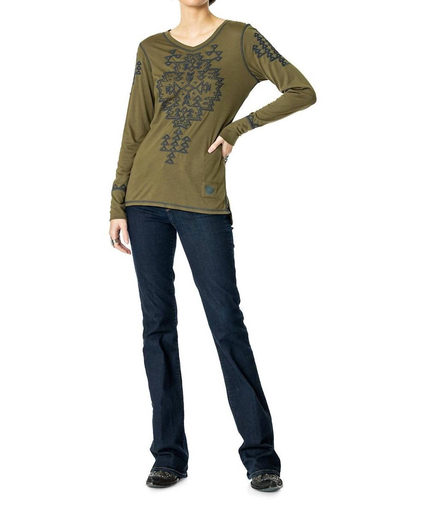 Great fit, cute design, soft fabric. You'll love everything about this long sleeve tee. Introducing the Rocky Ridge Long Sleeve Tee Top by Double D Ranch, a masterpiece of southwestern style with intricate string and chain-stitch embroidery. This women's tee, in a flattering slim fit, is crafted from a blend of 75% polyester and 25% rayon, promising comfort and style in the distinct Alfalfa hue. The V-neck design adds a touch of elegance, perfect for any occasion. Closure: Pull-on.