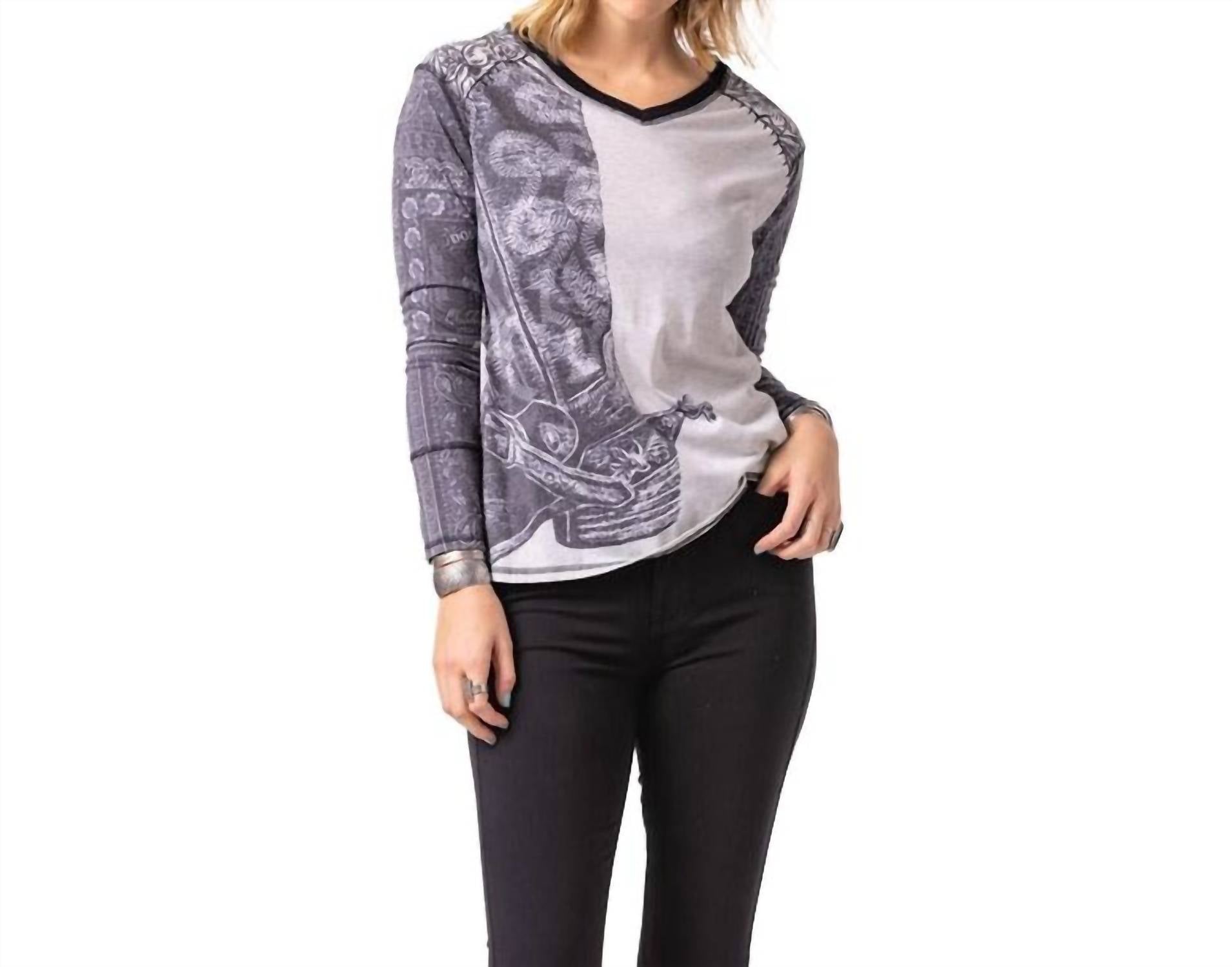 A timeless blouse that will never go out of style. Elevate your casual wardrobe with the Hide Tickler Long Sleeve Top from Double D Ranch's Wild Horses Collection. In a relaxed fit, this standout piece features long sleeves adorned with a bandana-style pattern and a shallow V-neckline to complement the oversized graphic of a spurred-up cowboy boot. Crafted from 75% polyester and 25% rayon, the tee is designed for both comfort and style in its unique silver spur hue. Easy to wear with a pull on closure, this top pairs effortlessly with leggings or flare jeans for an instantly polished look.