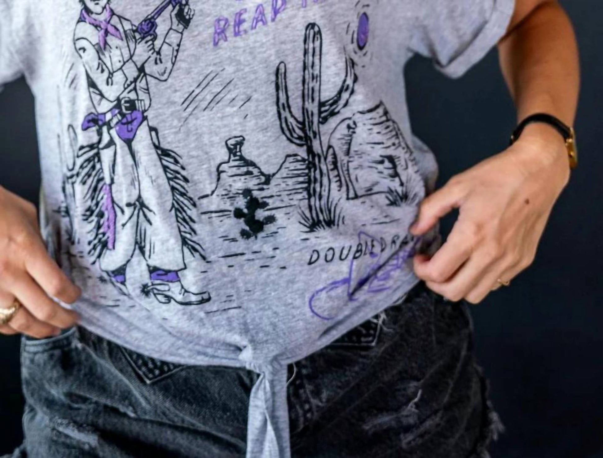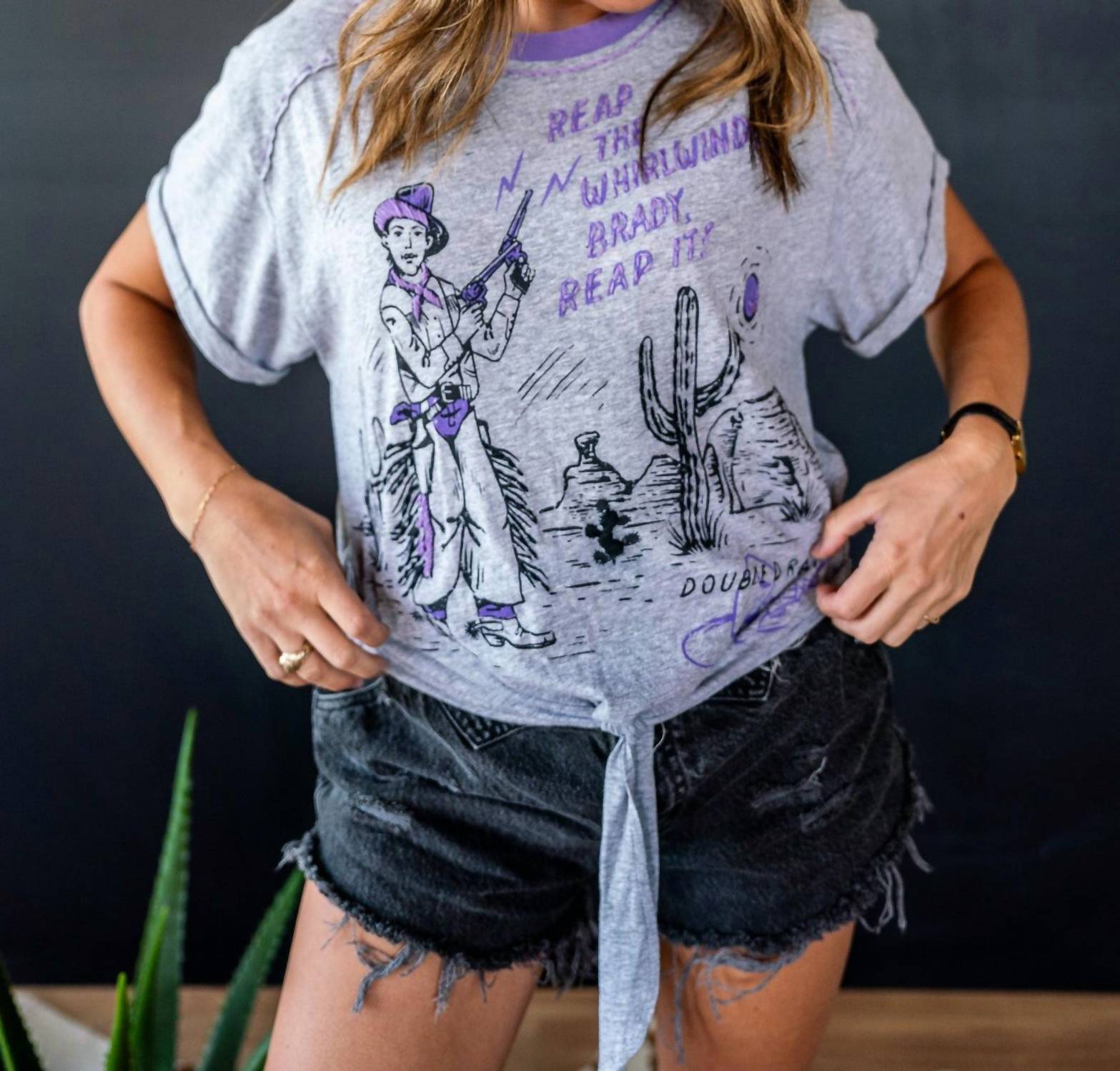 The short sleeve tee you'll want in every color. Introducing the "Reap the Whirlwind" Top by Double D Ranch, a chic and sassy piece that captures the essence of iconic lines with style. Crafted from 100% cotton, this short sleeve tee features a striking outlined illustration of Billy the Kid, paired with a whimsical phrase in pops of purple. The top is detailed with custom printing, embroidery, a back western yoke, and a front tie, exuding a slim fit for a flattering silhouette. Closure is pull-on, and the tee features a classic crewneck design.