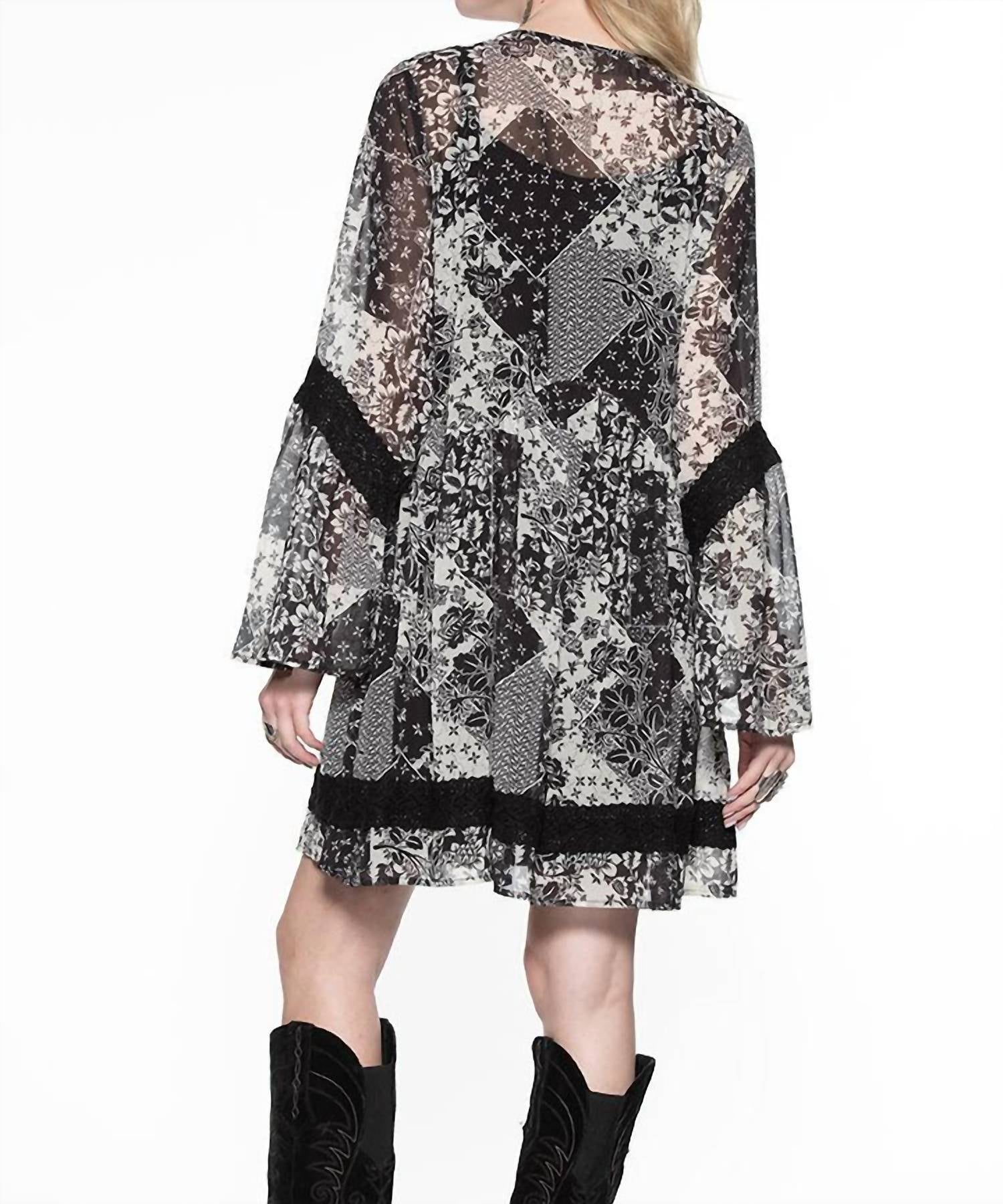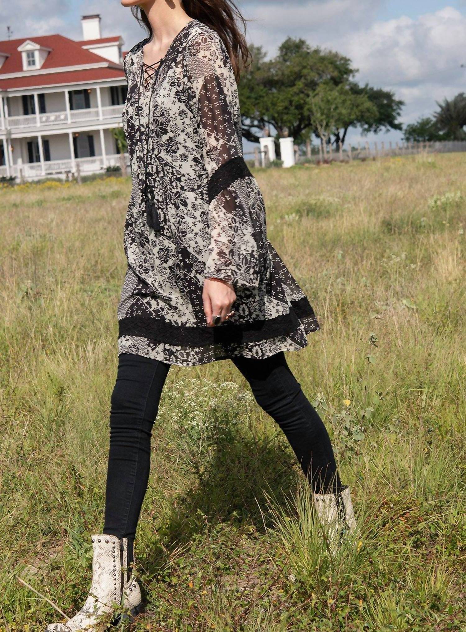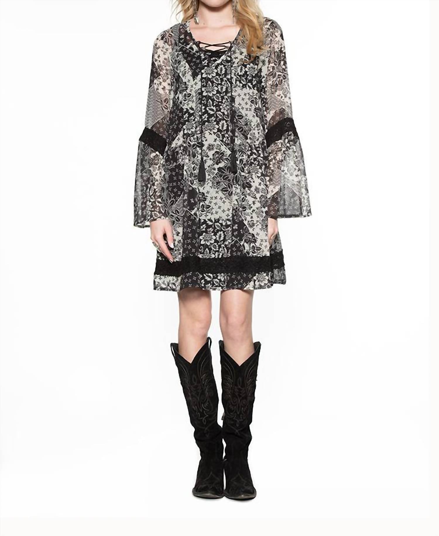 The perfect mini dress for those warmer months. Embrace rodeo romance with the Rita Blanca Dress by Double D Ranch, a stunning piece that merges patchwork and prairie trends. This dress features long sleeves and a flattering A-line silhouette with sheer details, lace, and a v-neck with a laced tie closure adorned with fringed tassels. Crafted from 100% polyester, this patterned mini dress in classic black is perfect for pairing with western boots. Care details are not specified for this garment.
