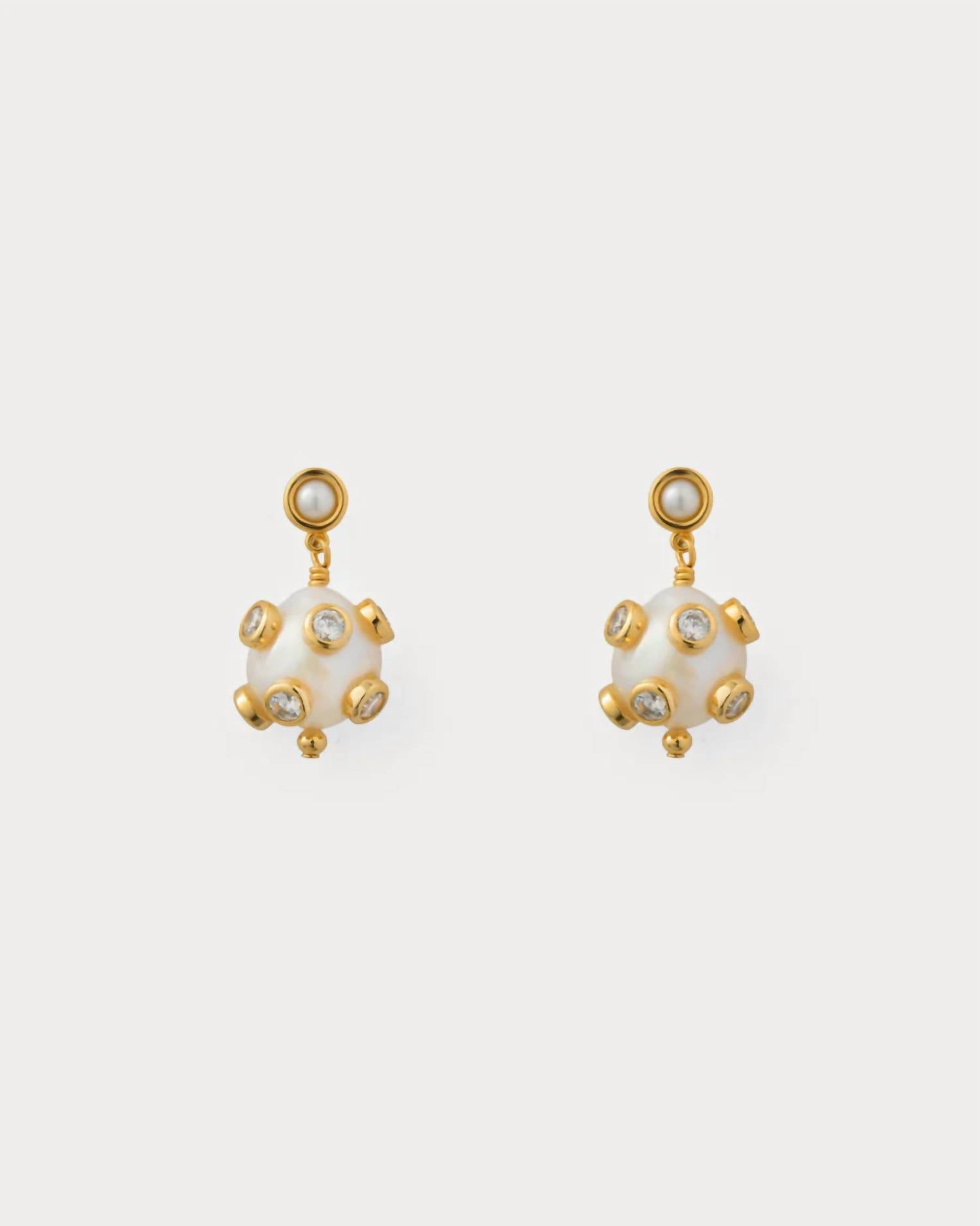 eye-catching earrings for every occasion. The Women's Buzo Earrings by Éliou are a standout fashion accessory, blending elegance and uniqueness in a stylish gold and white colorway. Handcrafted with 18k gold over recycled brass, these earrings feature freshwater pearls with hand-drilled cubic zirconia bezels, ensuring each pair is individually unique. Ideal for those who appreciate artisanal craftsmanship and sustainable luxury in their jewelry collection.