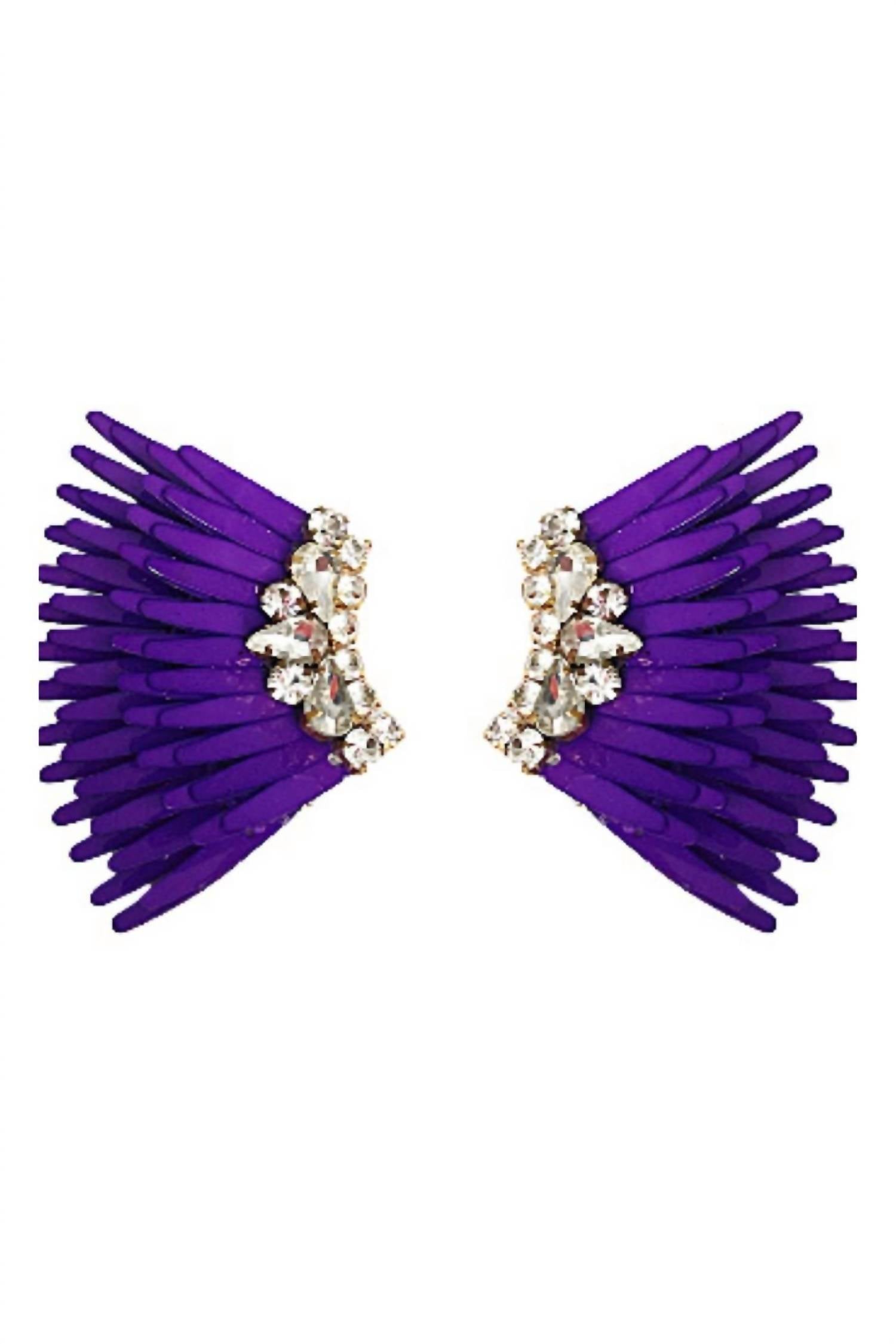 eye-catching earrings for every occasion. Elevate your accessory game with the Women's Mega Mini Madeline Earrings by Mignonne Gavigan, a striking fashion earring in vibrant purple. These earrings are crafted with 14k gold-plated brass and genuine leather backing, accented with sparkling crystal stones and secured with a stainless steel post. The simulant diamond adds a refined touch, boasting a carat size between 0.26 and 0.50. Measuring 1.50" in length and 1" in width, these earrings are perfect for adding a dazzling finish to any ensemble.