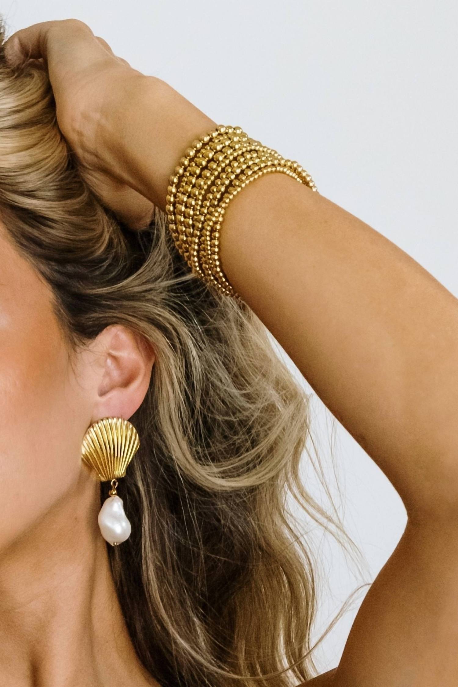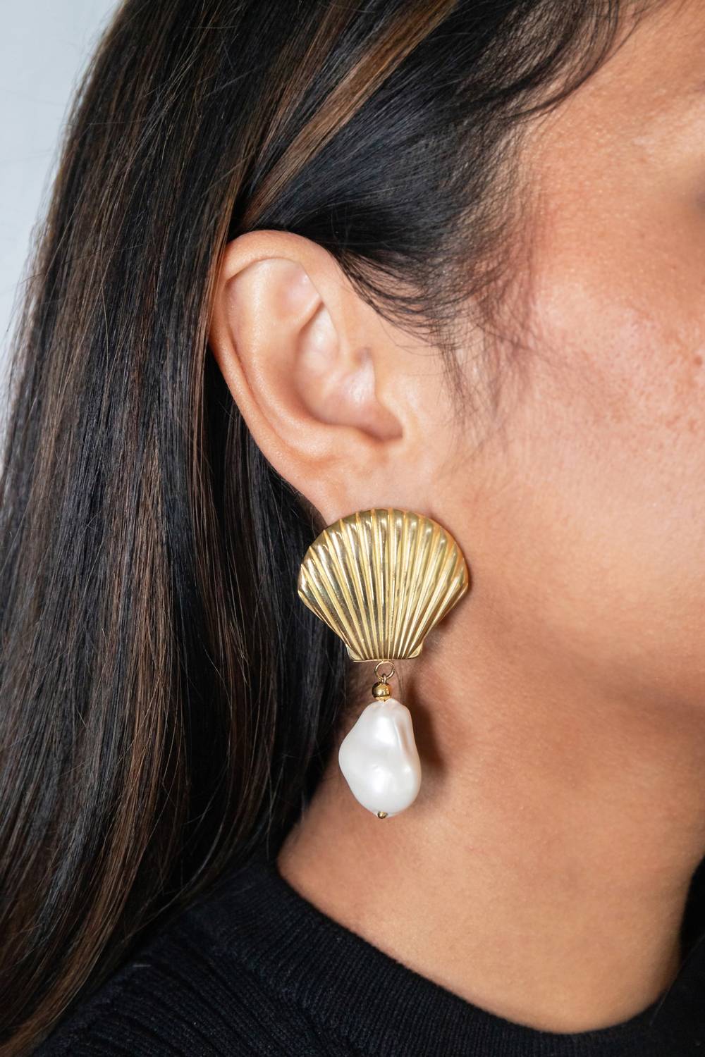 Easy and elegant earrings to complement any outfit. Introducing the Women's Maya Drops Earrings by Marrin Costello, a stunning accessory to elevate your style. Made from 14k gold-plated stainless steel, these statement earrings feature intricate shell designs and glass baroque pearl drops, offering a hypoallergenic, non-tarnish and water-resistant option for pierced ears. Measuring 2.5 inches in length and 1.25 inches in width, they include MC engraved earring backings for a secure fit. Perfect for any occasion, these earrings add a bold yet refined touch to any outfit.