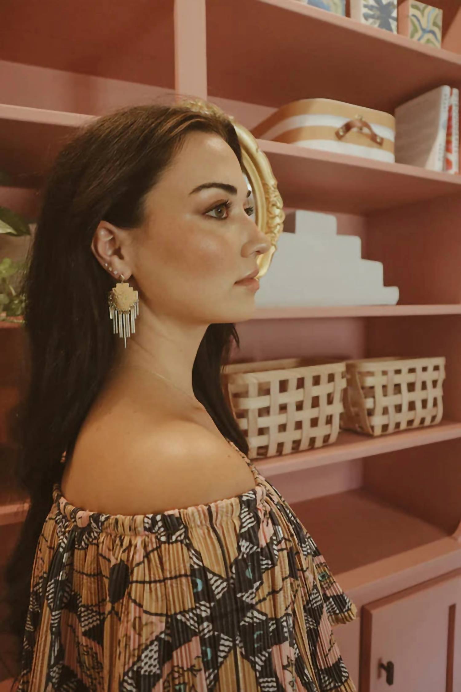Easy and elegant earrings to complement any outfit. Enhance your look with the Women's Zoned Out West Earrings by Allie Falcon, crafted to boost your confidence. These earrings feature a stunning stamped design complemented by gold thin dangle tassels. Made from 18k gold plated brass with secure sterling silver posts and backs, they measure a striking 2.75 inches. Country of origin details are not provided.