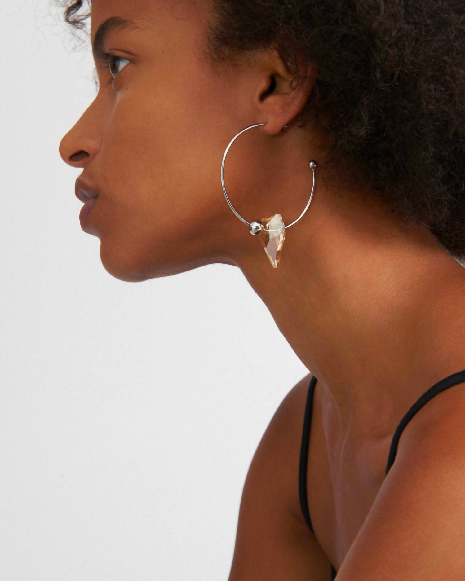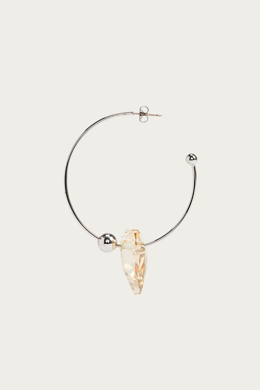 Handmade in France and cast from palladium-plated brass, this slim hoop earring is strung with a golden shadow Swarovski crystal and an eye-catching floating bead. Showcase the gentle movement with swept-back hair. Sold as a single earring. Length: 3" (7.5cm). Details: Palladium-plated brass, golden shadow Swarovski crystal, nickel-free. Care: Avoid contact with liquids, wipe dry with a soft cloth