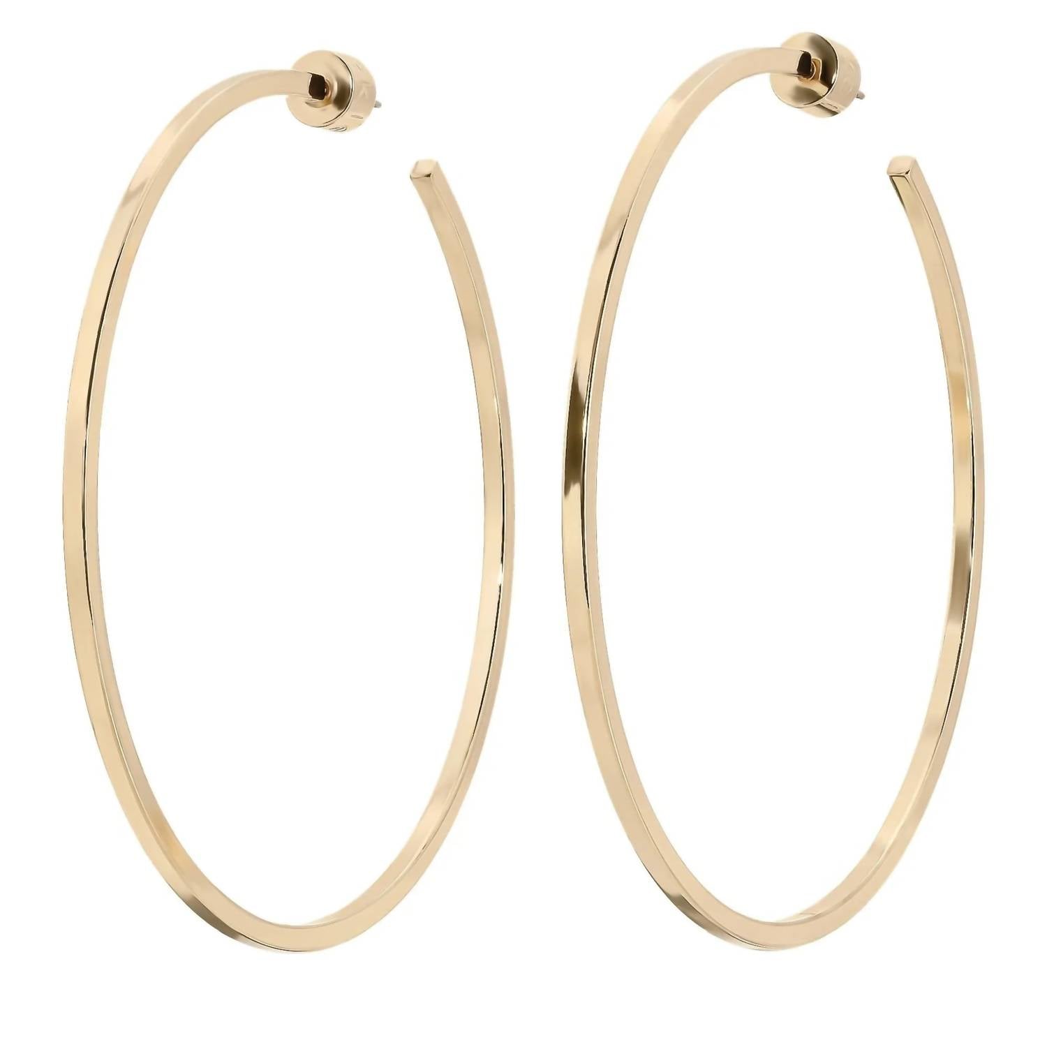 Easy and elegant earrings to complement any outfit. Elevate your jewelry collection with the Women's 3" Ava Hoops by eklexic, designed for fashion-forward individuals. These bold hoops feature a unique square wire shape and a generous 3" diameter, crafted from 14k Yellow Gold for timeless elegance. Closure: Push back. Enjoy the contemporary impact and sustainability of these consciously crafted earrings, perfect for any occasion.