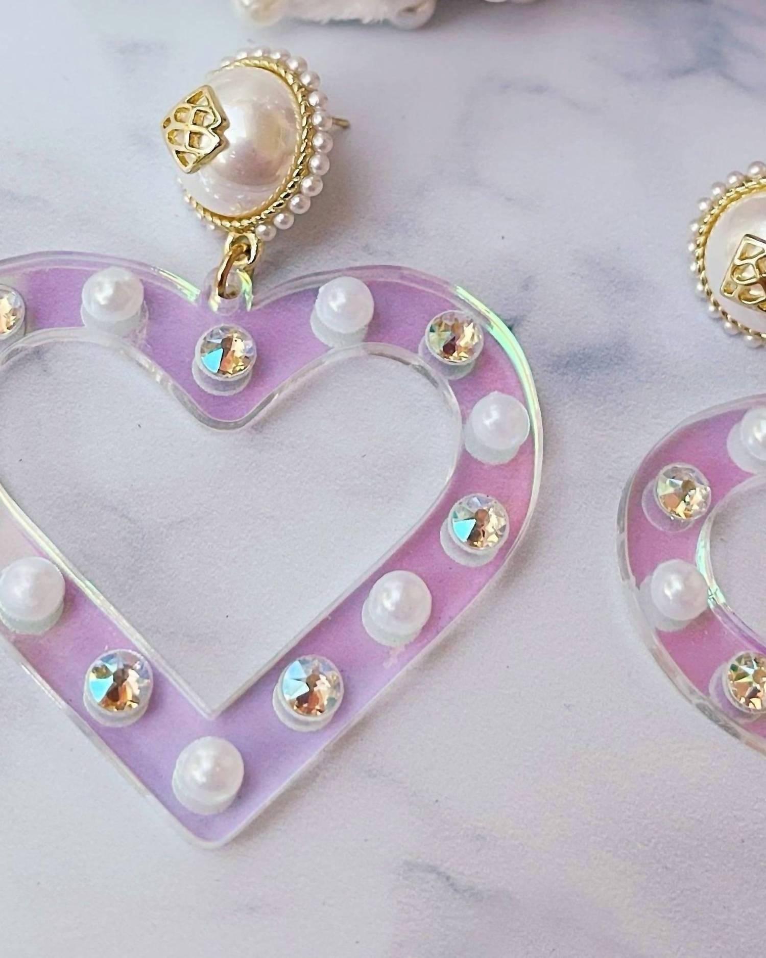 eye-catching earrings for every occasion. Introducing the Women's Iridescent Heart Earrings by Brianna Cannon, a striking addition to any jewelry collection. These dangle earrings are crafted from iridescent acrylic, featuring resin pearls and multicolor simulant crystals for a touch of sparkle. The gold-plated resin pearl top, embellished with the BC trademark logo, adds a luxurious finish. Measuring 2.5 inches in length, these earrings require gentle care: avoid swimming, exercising, or applying hairspray and perfume while wearing them, and clean gently with a soft cloth and water.