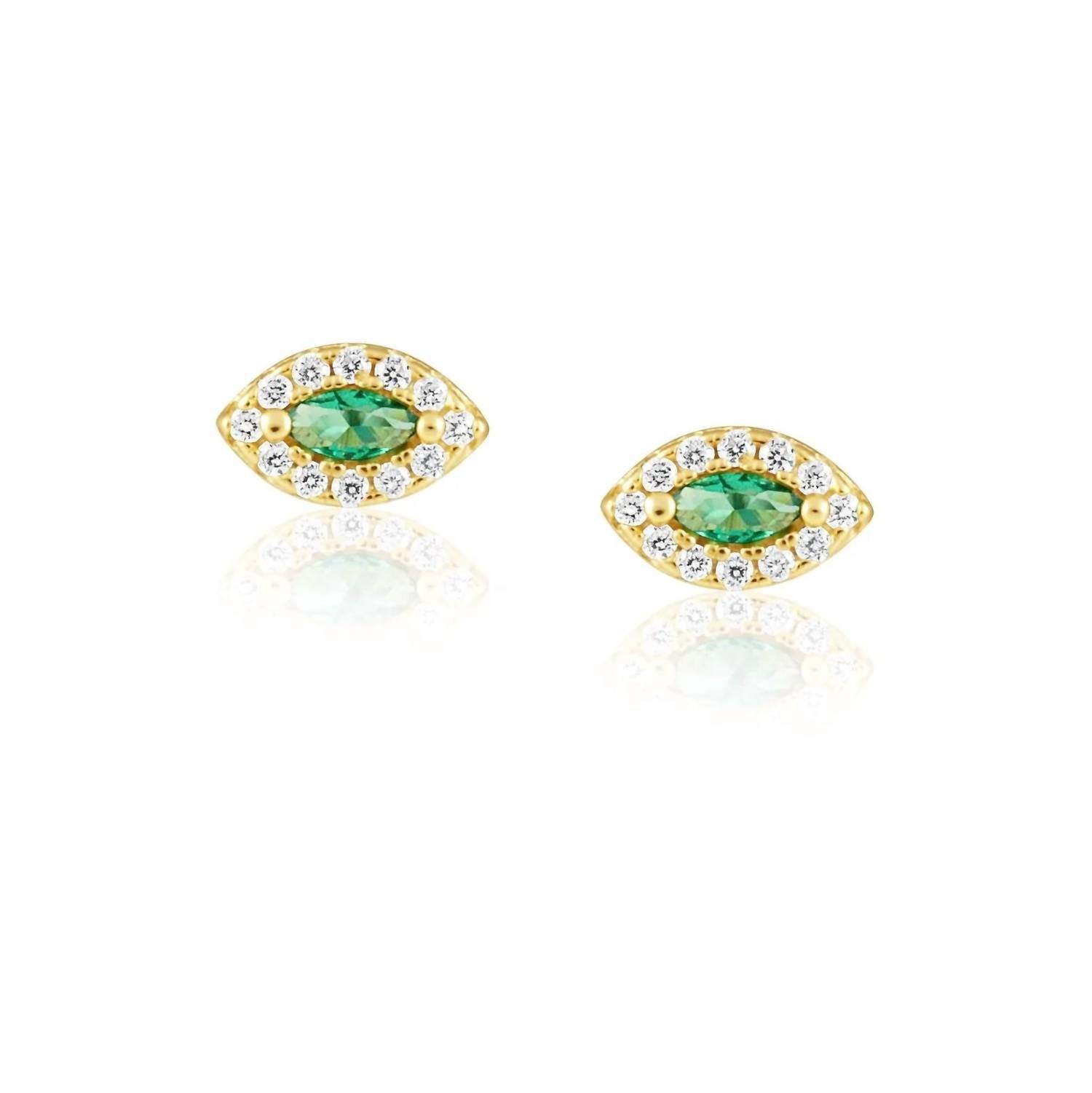 eye-catching earrings for every occasion. Introducing the Women's Alma Evil Eye Studs Earrings by SAHIRA, a captivating accessory that embodies both style and resilience. Crafted from 18k plated stainless steel, these studs feature dazzling CZ crystals with a central emerald-toned simulant stone, perfect for stacking with other pieces. Their water and tarnish-resistant qualities ensure lasting beauty. The earrings showcase a bezel setting and oval-shaped gemstones, making them a chic addition to any jewelry collection.