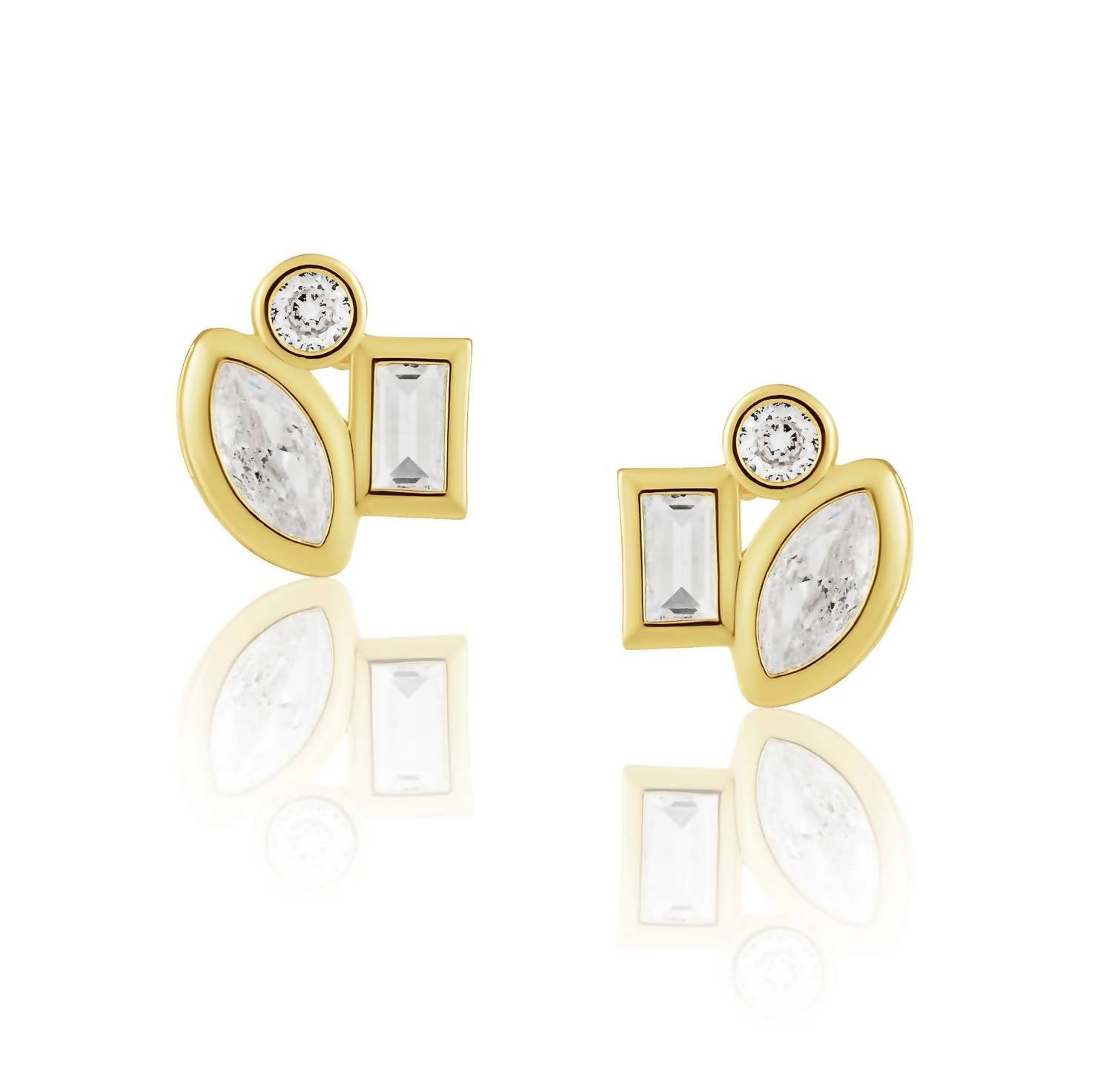 Easy and elegant earrings to complement any outfit. Enhance your elegance with the SAHIRA Women's Amber Studs Earrings crafted in 18kt gold-plated stainless steel. These fashion earrings feature a sophisticated round, marquise, and baguette design set in bezel, showcasing brilliant white cubic zirconia simulant stones. With their water and tarnish-resistant properties, they're made to last, ensuring enduring style.