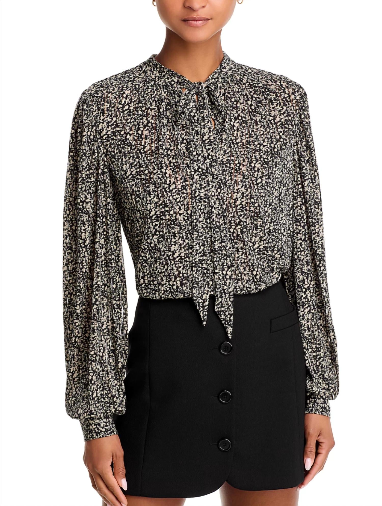A long sleeve top you can wear with denim, skirts, well... just about anything! Self-tie neck Keyhole at front neck Blouson sleeves Pullover style Abstract print