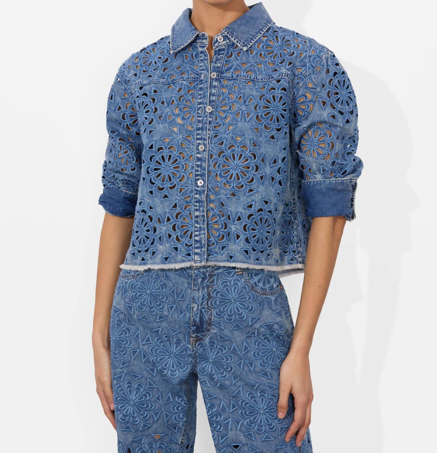 Cute, casual, and comfortable. This jacket is a must have. Introducing the Finely Cropped Oversized Shirt by alice + olivia in Avery Blue, an artistic fusion of style and comfort. This long-sleeve piece, crafted from 100% cotton lasercut denim, boasts a chic floral pattern and relaxed silhouette. With a fashionable cropped fit measuring 18 inches from the shoulder, it is ideal for layering or standalone wear. Closure: Button Closure. Care: Dry clean only. Ideal for women seeking a modern twist on a wardrobe classic. Model is 5'10" and wearing a size XS.