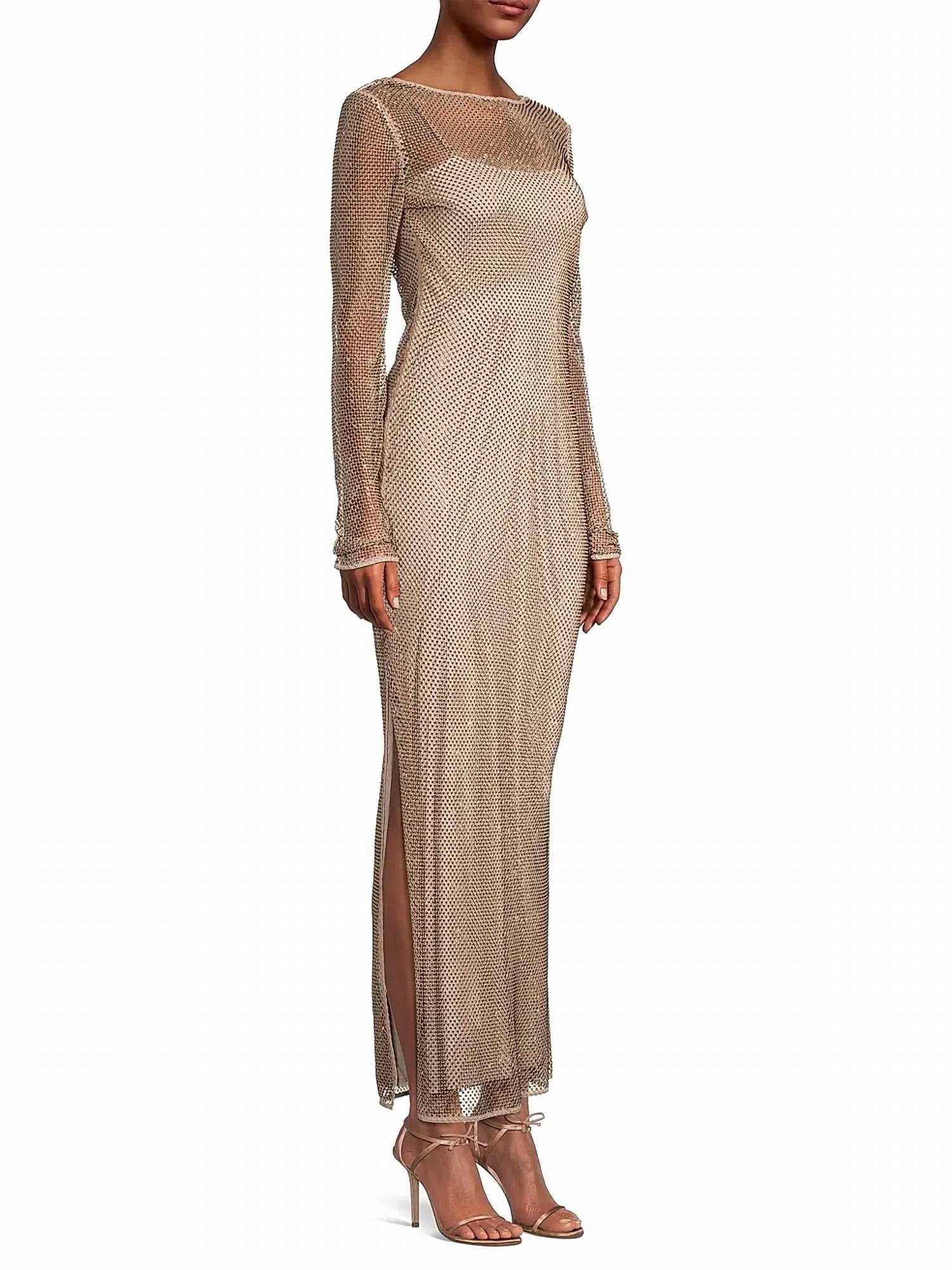 Style this maxi with your favorite statement necklace and sandals for the perfect look. The Lulu Studded Mesh Maxi Dress by Ramy Brook is an elegant choice for your evening events, featuring long sleeves and a luxurious sheer stud mesh overlay for just the right hint of skin. Crafted from 90% polyester and 10% spandex, this dress includes a formfitting slip lining and measures about 63 inches from shoulder to hem. Made for pull-on ease, it is imported and requires dry cleaning to maintain its distinctive textured look. With a boatneck design, this gown is perfect for cocktail parties and spring occasions, offering a breath of quiet luxury.