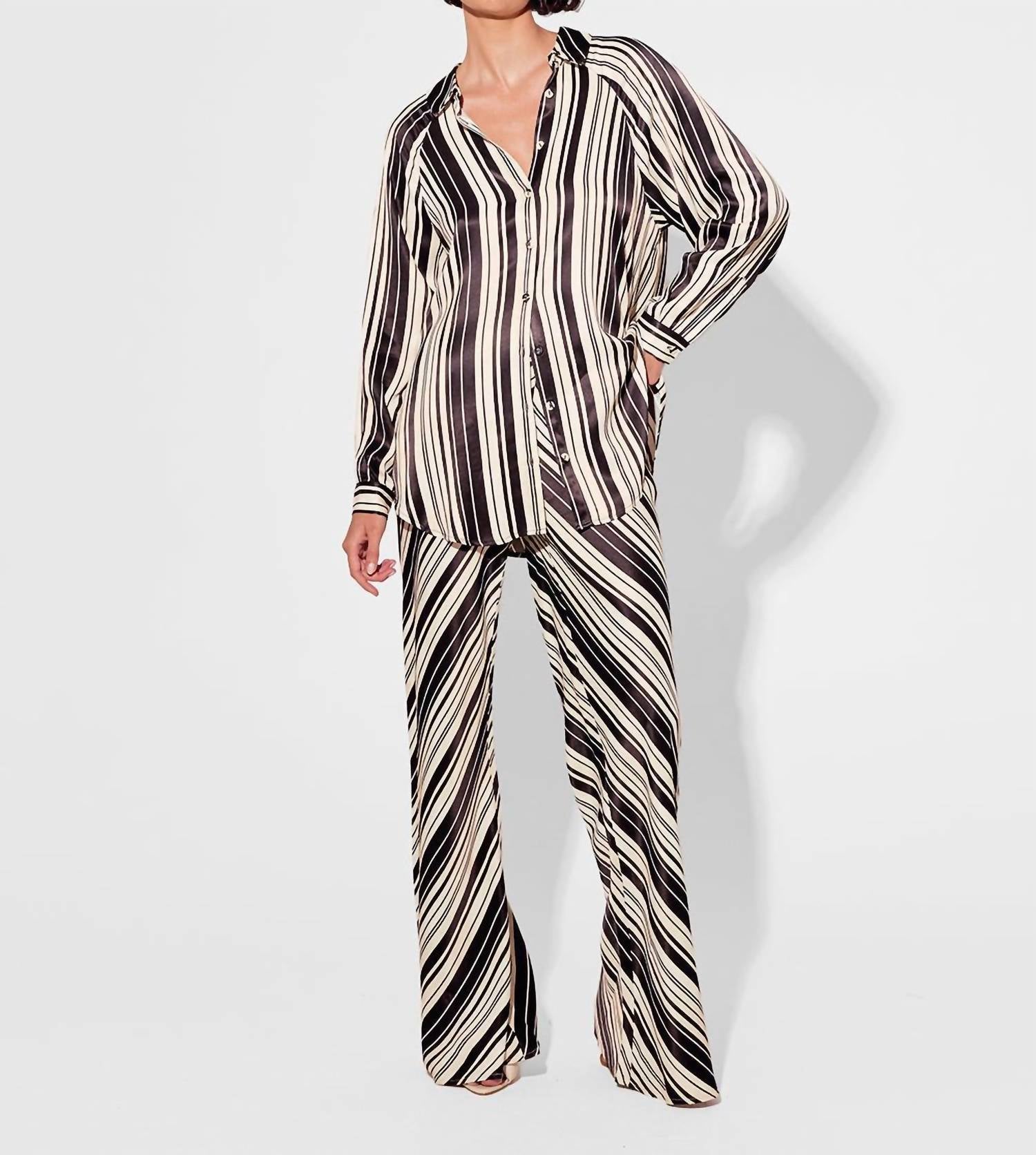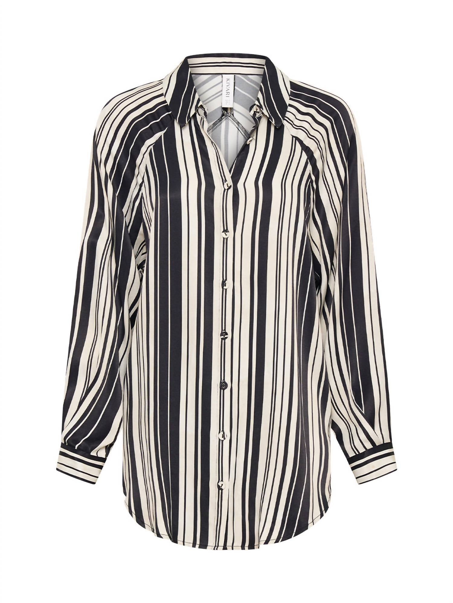 A classic button down shirt that will never go out of style. Introducing the Sara Shirt by KIVARI, a chic women's button-down in a timeless black and white stripe pattern. Designed with long sleeves and a classic collar, this shirt is perfect for elevating your wardrobe. Experience convenient styling with its pull-on closure. Care is simple: hand wash and line dry for best results.