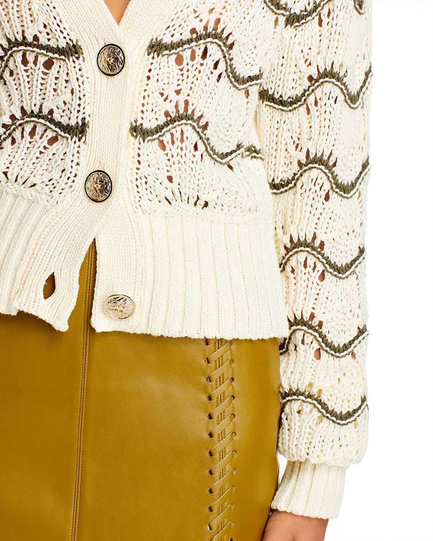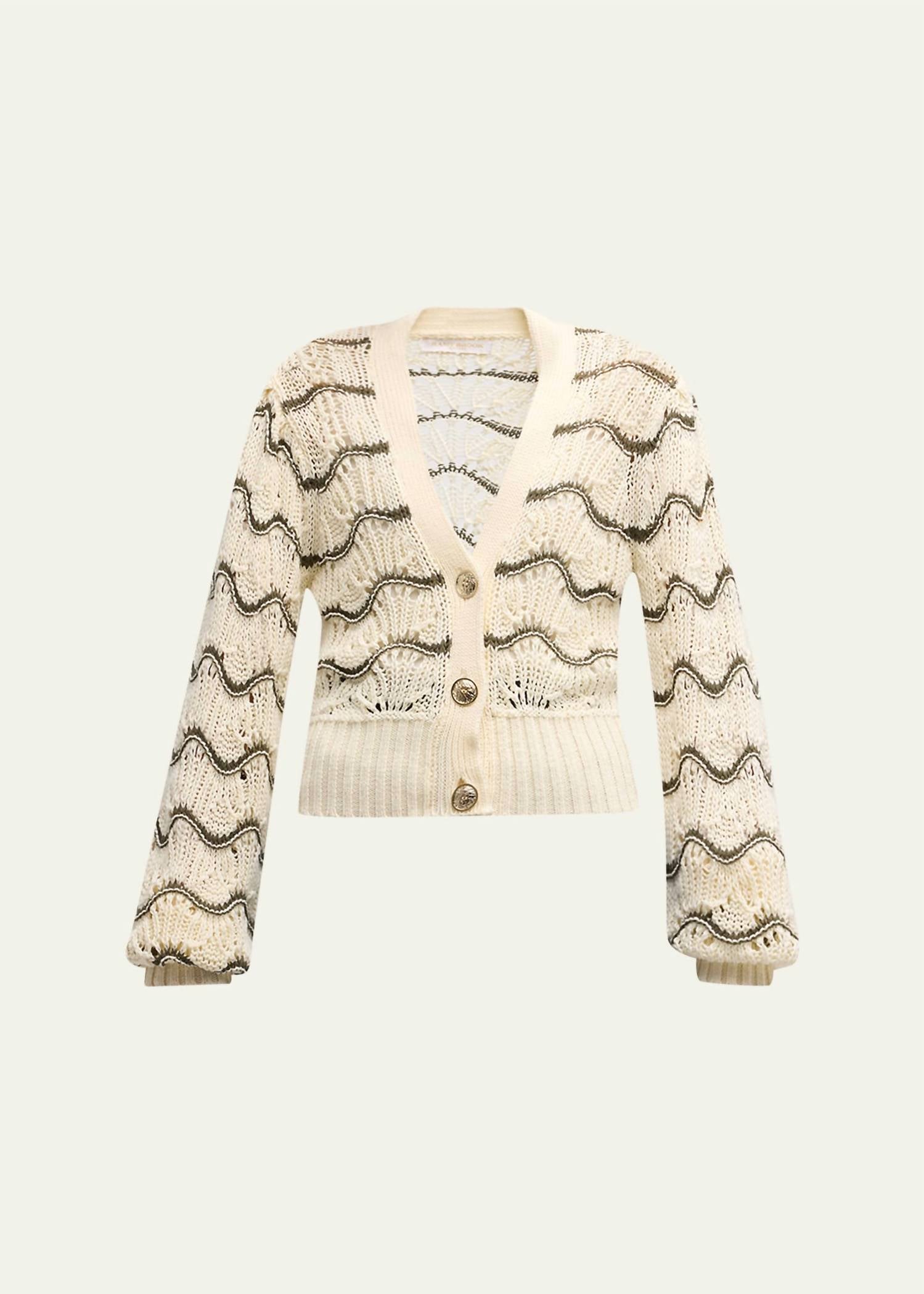 Throw this adorable cardigan over any cami or tank top. Introducing the Daniela Cardigan by Ramy Brook, a stylish addition to your wardrobe. This ivory cardigan features long sleeves and a V-neck design. Crafted from 100% Cotton with a wavy print, it offers a chic look while keeping comfort in mind. This 25" length garment is finished with a button closure and requires hand washing for care.