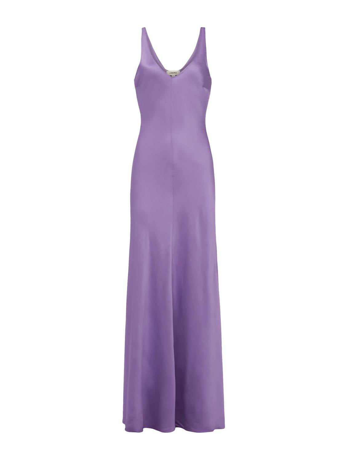 Scoop neck dress in orchid. A stunning gown length maxi slip dress in purple orchid. Slim straps release into a sexy double-scoop neckline. Bias-cut clings to curves, creating an hourglass silhouette, before releasing into a flared hem. Silk-like fabric creates beautiful movement and flow and can be altered for ideal fit.. No closures. 55% Rayon 45% Viscose. About 57.7" From Shoulder to Hem. Model Details: Height: 5'10" | Bust: 34" | Waist: 23'' | Hips: 34.5'' | Wearing Size 2. Imported