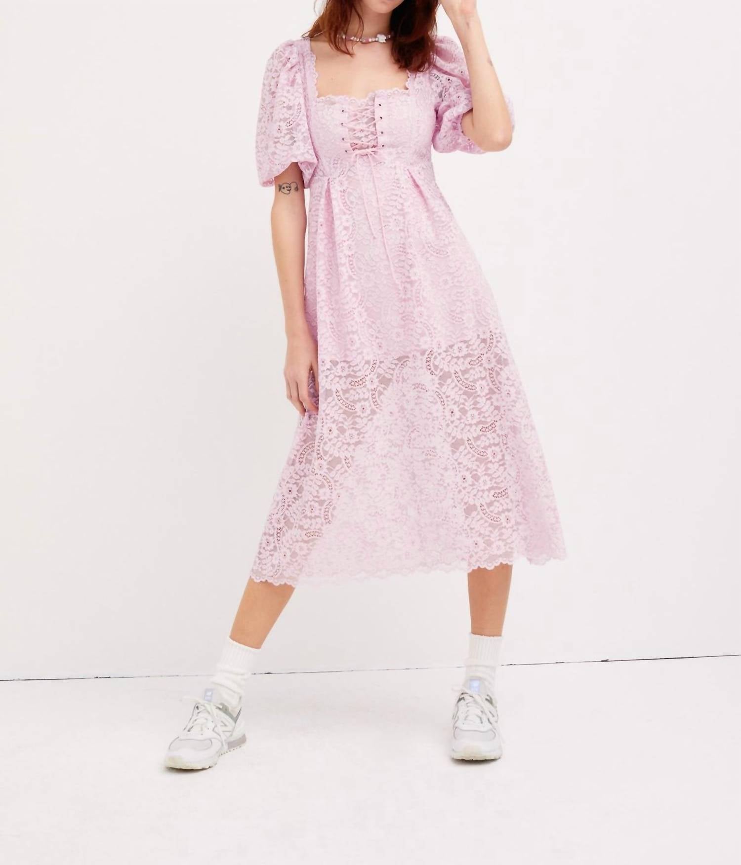A midi dress so versatile, your options for wearing it are endless. Introducing the Carmela Midi Dress by For Love & Lemons, a boho-chic piece perfect for your summer vacation. This dress features elegant short puff sleeves and a romantic sweetheart scallop edge neckline with a lace-up bodice that defines the waist with angled seams. Crafted from 100% polyester with a lining of 98% recycled polyester and 2% spandex, it embodies both style and sustainability. Closure is a center-back invisible zipper for a seamless fit, and care includes machine wash and line dry.