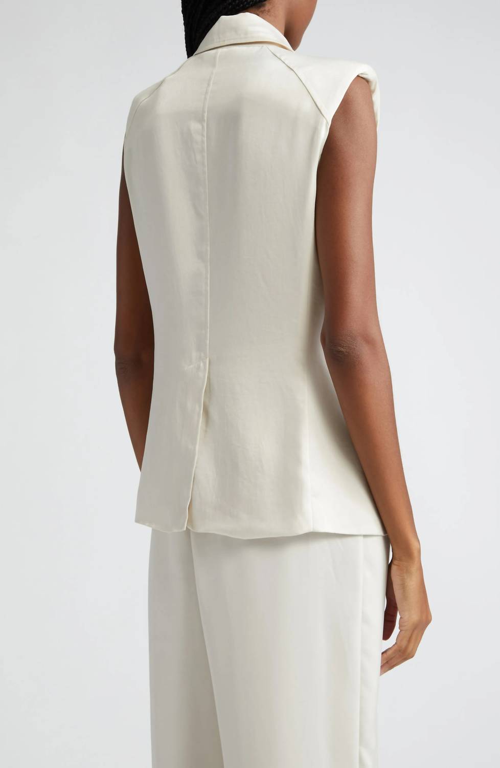Throw this vest over an all black outfit for a perfectly polished look. Elevate your wardrobe with the Angie Vest by Ramy Brook, an elegant piece in a subtle jute color. This sleeveless vest features padded shoulders and a V-neck complemented with notched lapels for a sophisticated silhouette. Crafted from 100% Polyester, it includes practical chest and front welt pockets and a back vent for ease and style. Designed with a one-button closure, it measures 25 inches in length and is imported. Dry clean only.