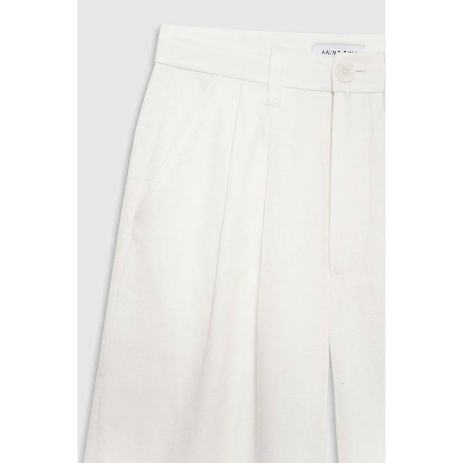 Experience effortless elegance with the Carrie Linen Blend Pants by ANINE BING, perfect for elevating your wardrobe. These high-rise, wide-leg trousers in white linen feature a breathable composition of 35% Lyocell, 32% Linen, and 33% Rayon, offering comfort and style. The pants boast front pleat details, a concealed zip and button closure, as well as back welt and slanted side pockets for practicality. To maintain their minimalist charm, cool machine wash with similar colors is recommended.