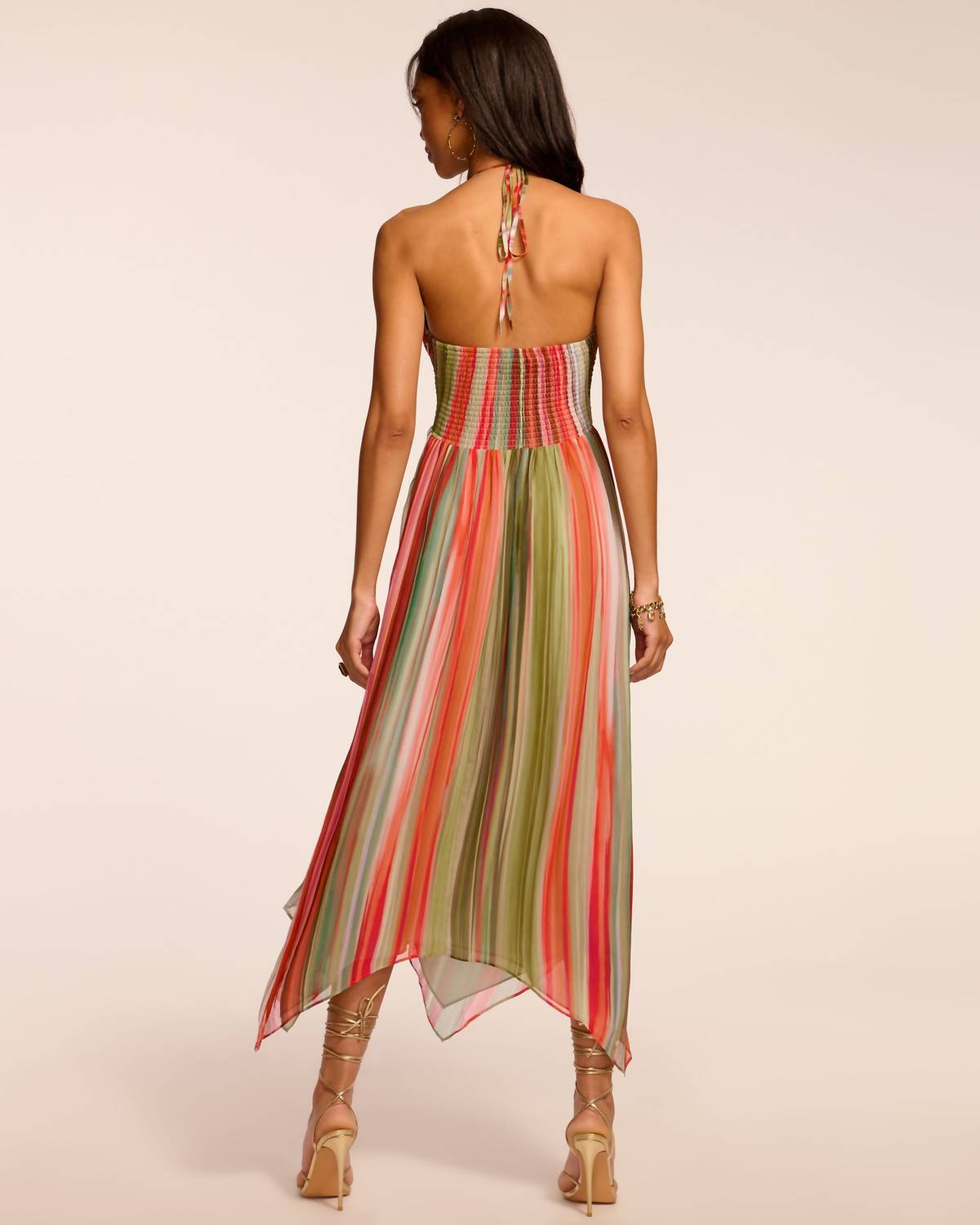 The perfect length dress does exist. Elevate your vacation wardrobe with the Anaja Silk Chiffon Cutout Midi Dress by Ramy Brook, an epitome of sophistication in a captivating Mint Stripe design. This sleeveless dress features a halter neck with a self-tie closure and a smocked back bodice for a flattering empire waist silhouette. Crafted from 100% Silk, the handkerchief hem and intriguing cutout detail add a touch of maximalist charm. Care for this exquisite piece by opting for dry cleaning, ensuring it remains a staple for Valentine's Day and beyond.