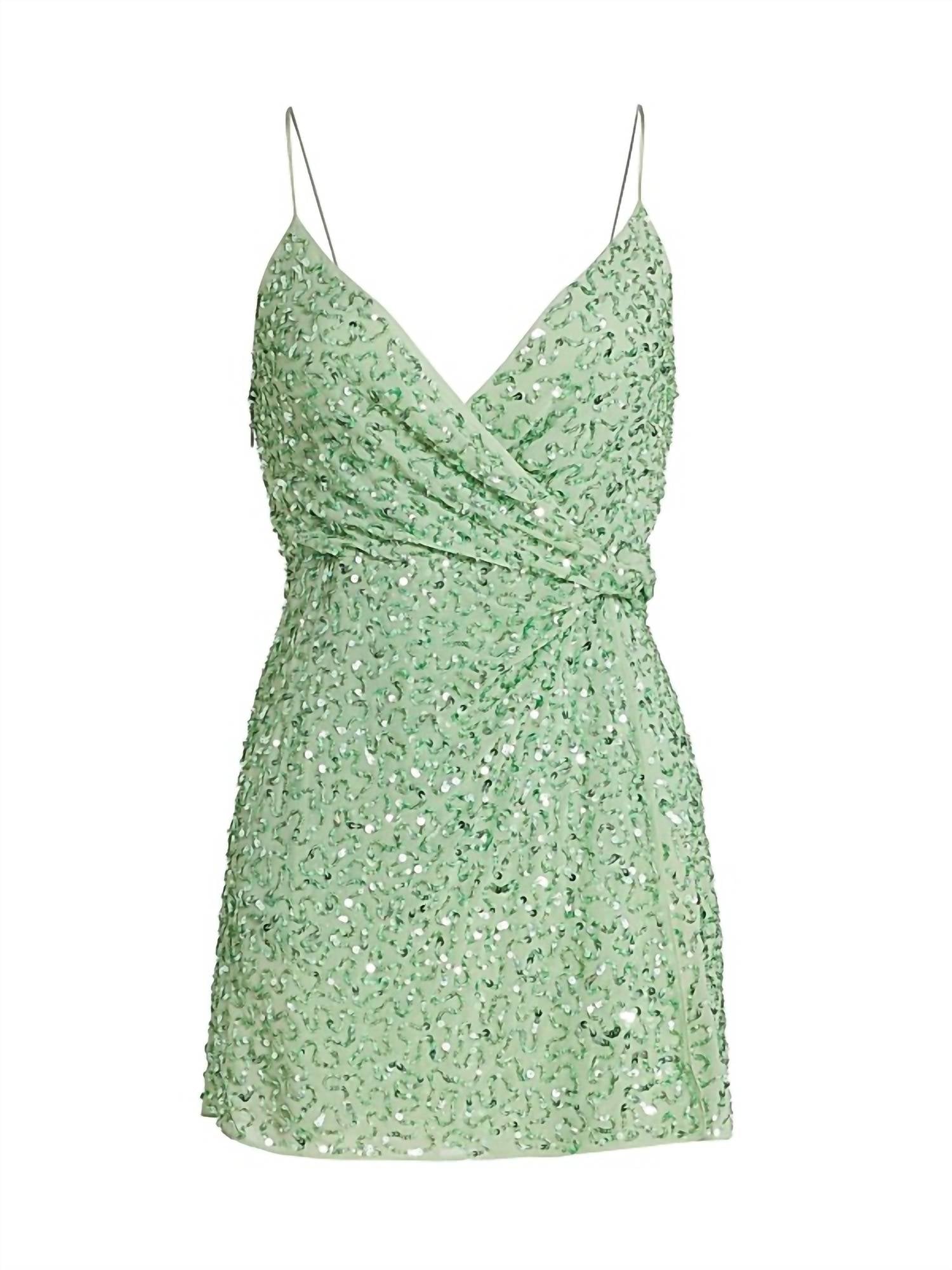 The perfect mini dress for those warmer months. Introducing the Celestine Wrap Dress by Alice + Olivia, a stunning piece perfect for evening events. This mini dress in light sage features spaghetti straps and a sweetheart neckline for an elegant silhouette. Crafted from a lightweight crepe, it boasts a 100% polyester shell and an intricately lined interior with 94% polyester and 6% elastane. The draped fabric and twist detail at the waist add to its charm, while hidden side zipper closure ensures a seamless fit. Adorned with bead and sequin embellishments, this dress is made in India and requires dry cleaning.