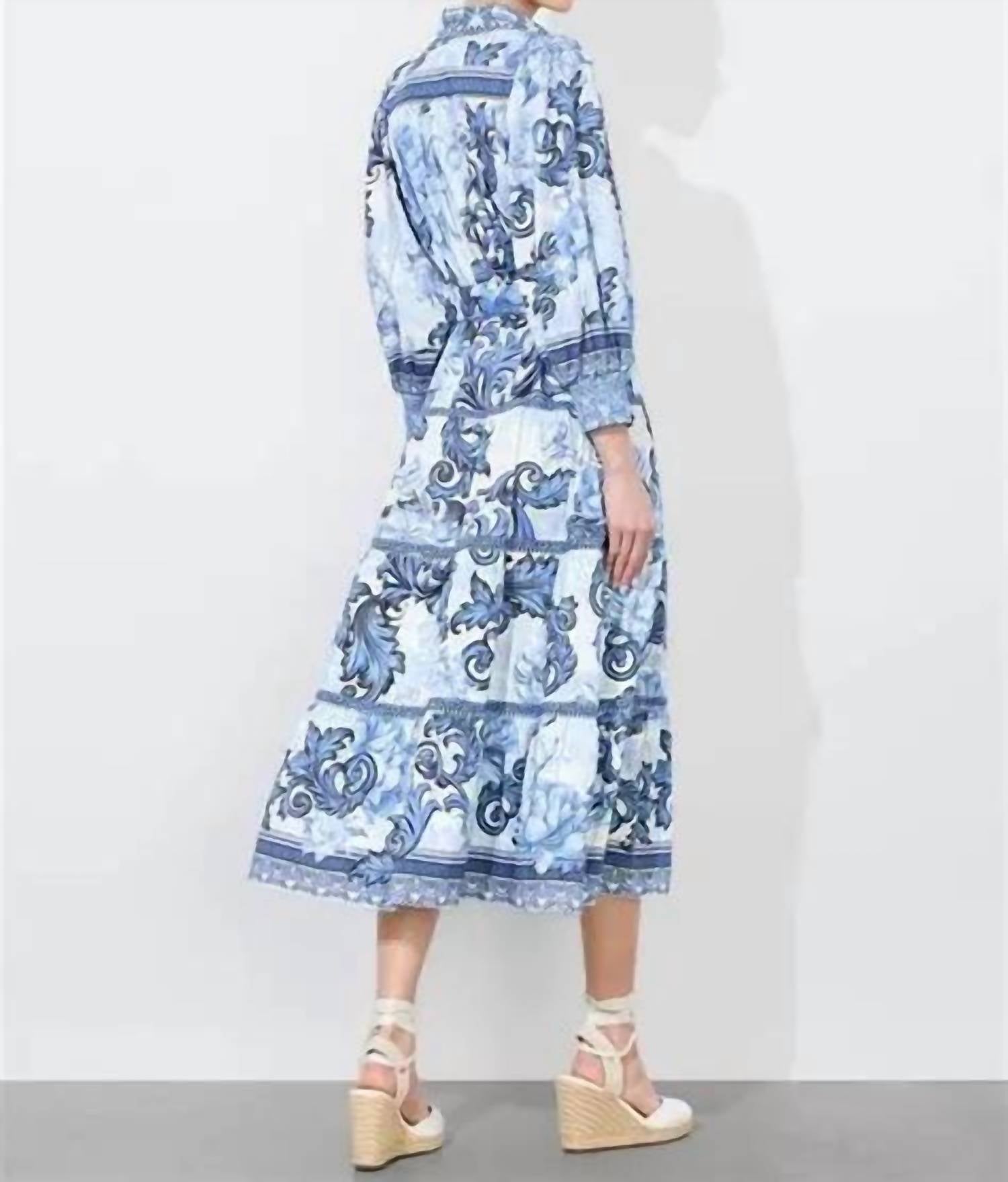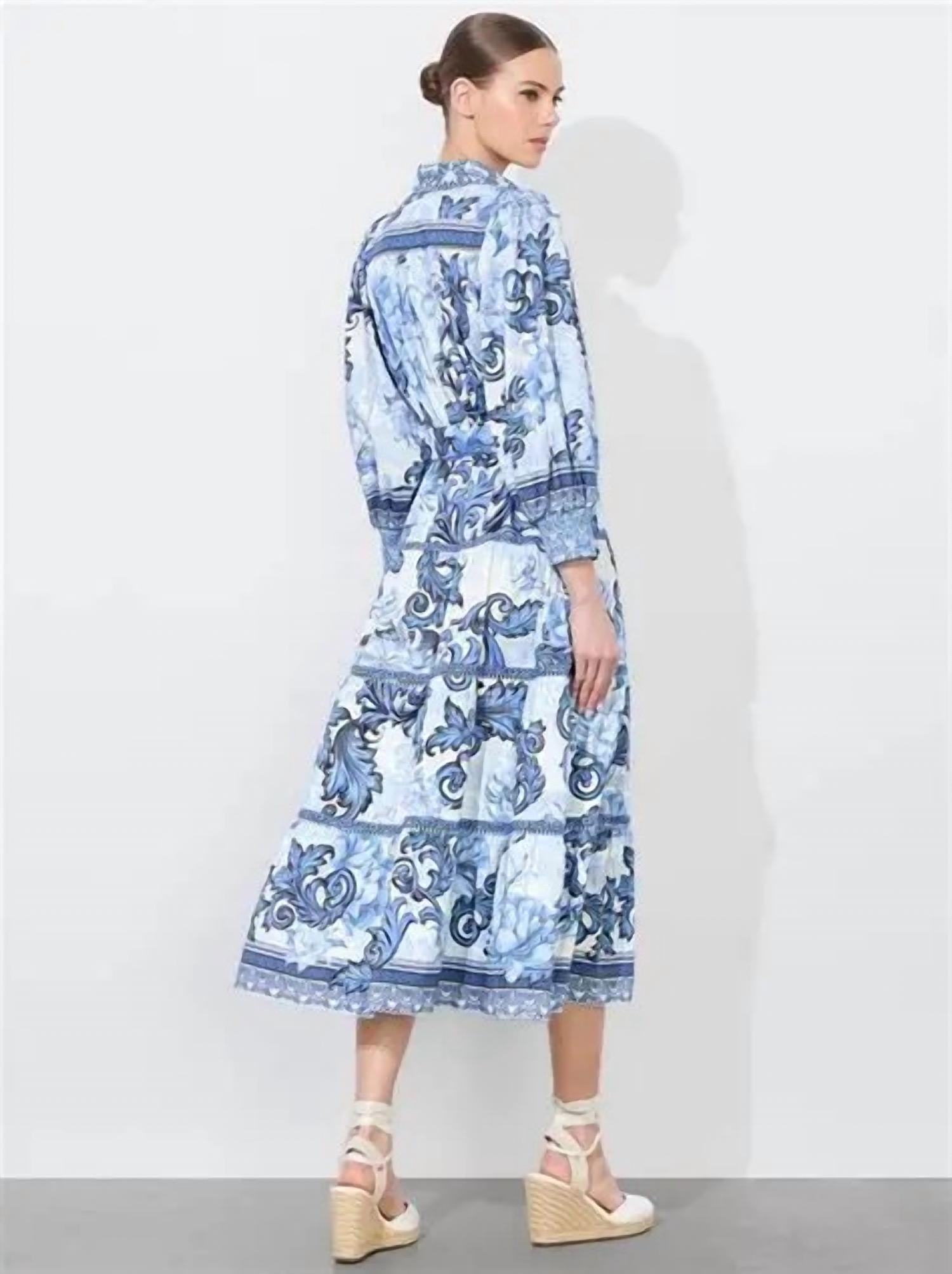 A midi dress so versatile, your options for wearing it are endless. This blue and white floral tiered dress is the perfect transitional piece. Geneva has a crisp poplin body with voluminous blouson sleeves. A front placket and neat collar give it structure while its full skirt adds a romantic touch. Undo the top few buttons for a more relaxed feel. Midi length Button front Hidden placket Blouson sleeves Digitally engineered print on soft poplin 97% cotton, 3% elastane Dry clean only Imported