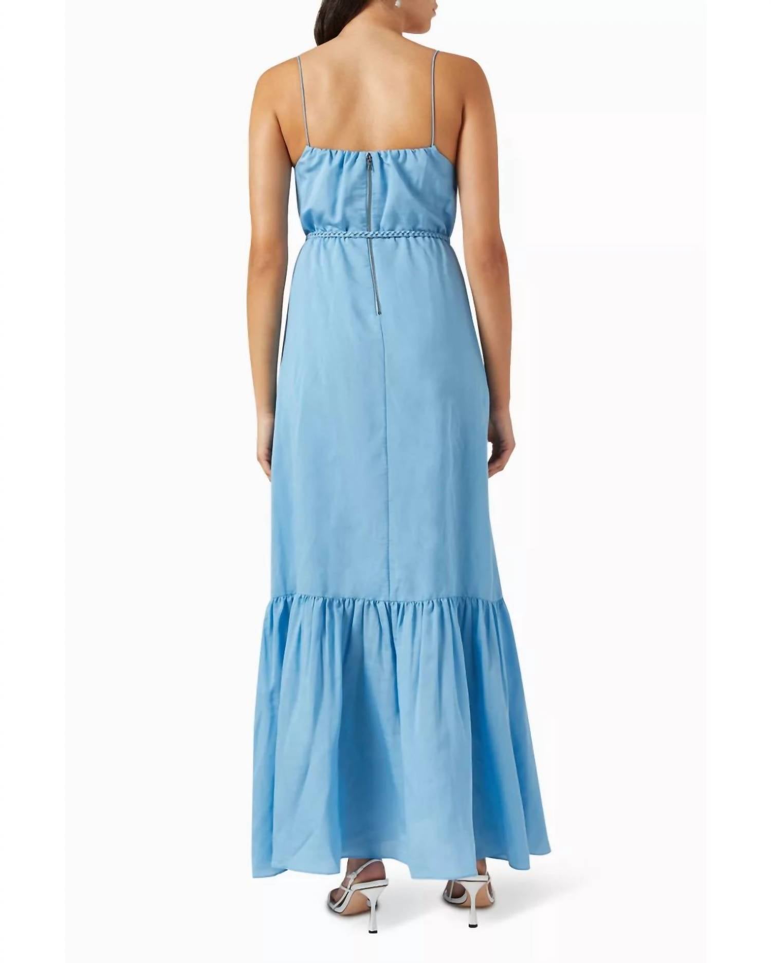 Style this maxi with your favorite statement necklace and sandals for the perfect look. Introducing the Jayda Tie-waist Tiered Dress by Alice + Olivia, a boho chic masterpiece in serene blue designed for those summer getaways. This maxi dress features a delicate spaghetti strap style with a flattering squareneck and an A-line silhouette, adorned with braided trims and a gathered hem for added elegance. The composition is a luxurious blend of 80% Lyocell and 20% Polyester, ensuring both comfort and style. Closure: Zip fastening along the back. Care: Dry clean only. Model is 180cm/5'11" and wearing a US 2.