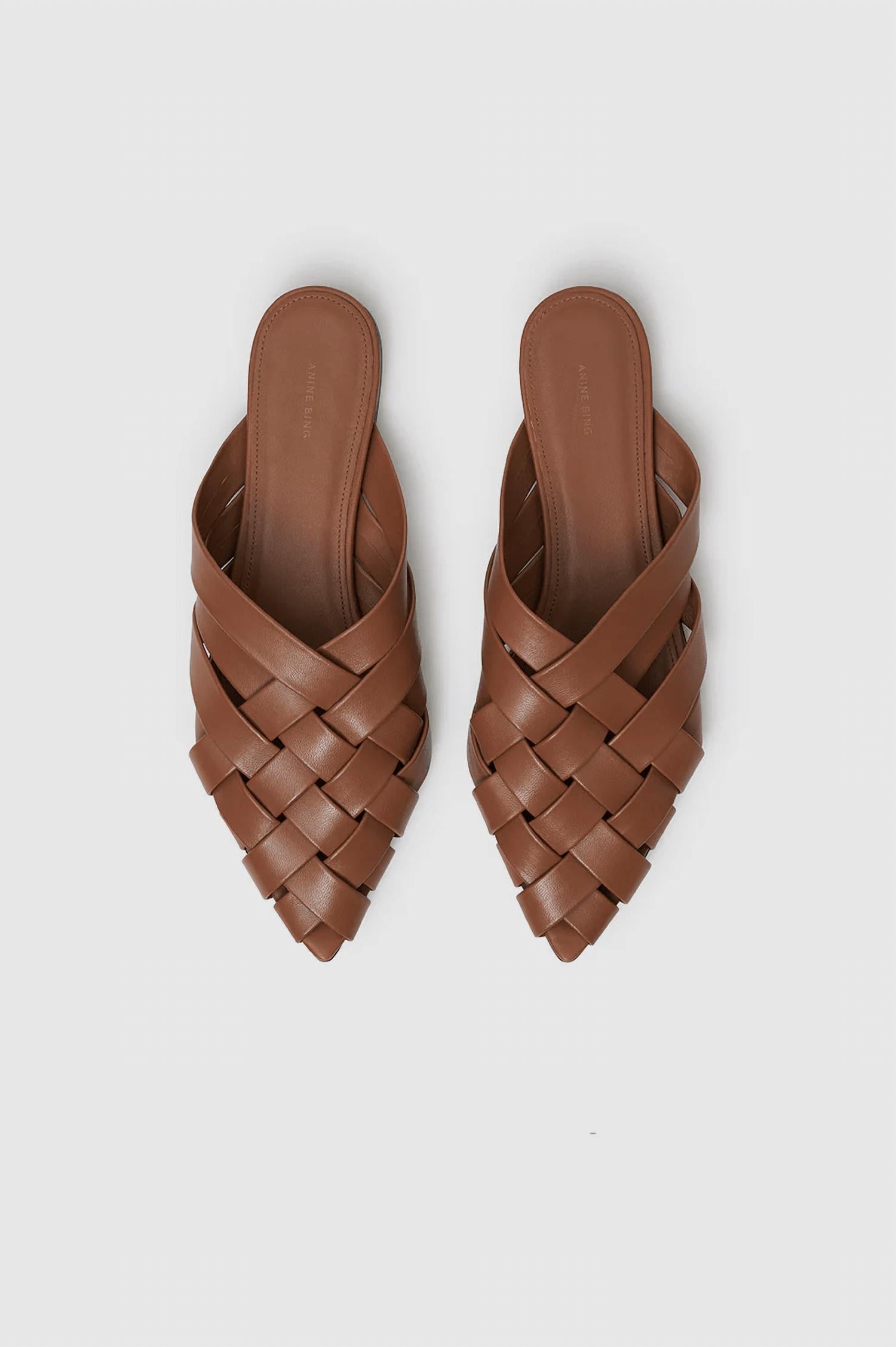 A preppy yet feminine take on the classic loafer. The Women's Eve Flat Shoe by ANINE BING is a stylish slip-on featuring high-shine woven padded straps crafted from 100% goat leather in a sophisticated cognac hue. Made in Portugal, this shoe highlights a subtle pointed toe and cushioned insole for comfortable wear, enhanced with elegant gold monogram hardware. The shoe is finished with a high-shine leather outsole and a flat 0.3" heel, perfect for a holiday party or a preppy spring look. Care for these flats by spot cleaning as needed. The model is wearing a size 40 (Her measurements: height 5'7.5", bust 32", waist 23.5", hips 34.5"). If you're between sizes, it's recommended to size up for an ideal fit.