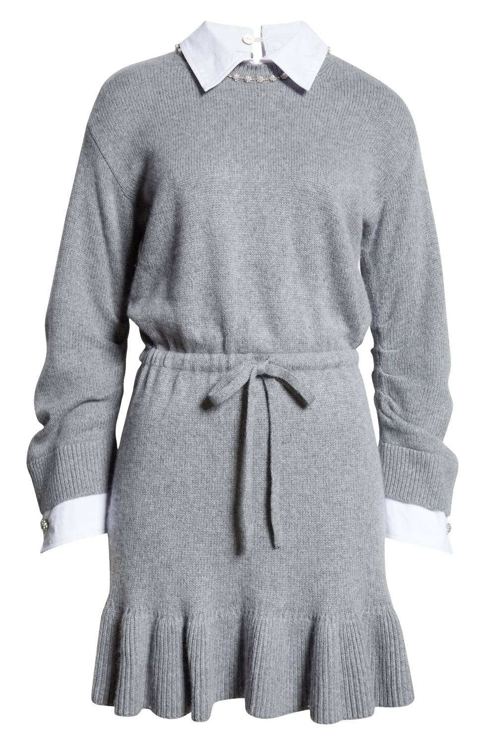 A flattering yet comfortable dress you'll be reaching for season after season. Elevate your style with the Kiana Pearl Necklace Long Sleeve Sweater Dress by Cinq a Sept, offering a chic two-piece illusion in heather grey and white. This women's A-line dress features long sleeves, a spread collar, and a unique pearl necklace accent for an instant, effortless look. Its composition blends 33% viscose, 23% recycled nylon, 20% cotton, 20% wool, and 4% cashmere, ensuring comfort and style, while the drawstring waist provides a tailored fit. With a 33.5-inch length, this imported piece is perfect for a dinner party, complete with a back keyhole and button-and-loop closure; remember to dry clean to maintain its textured finish.