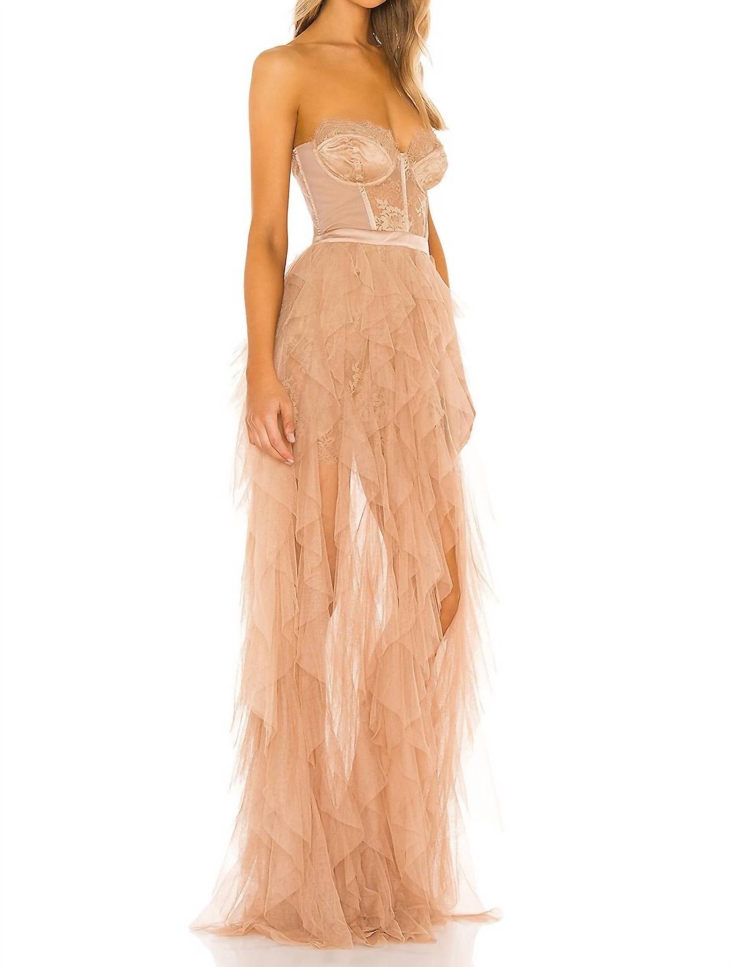 No straps necessary! Step into elegance with the Bustier Gown by For Love & Lemons, designed in a timeless Warm Taupe. This strapless gown features a sweetheart neckline and a fit-and-flare silhouette, making it a perfect choice for a black-tie event. Crafted with a luxurious composition of 100% nylon and contrasting fabrics, it boasts a boned bodice with underwire cups, an attached bodysuit with snap button closure, and a hidden back zipper closure. Made in China, this gown measures approximately 24 inches from the neckline to the shortest hem and 64 inches to the longest hem, and requires dry cleaning for maintenance.