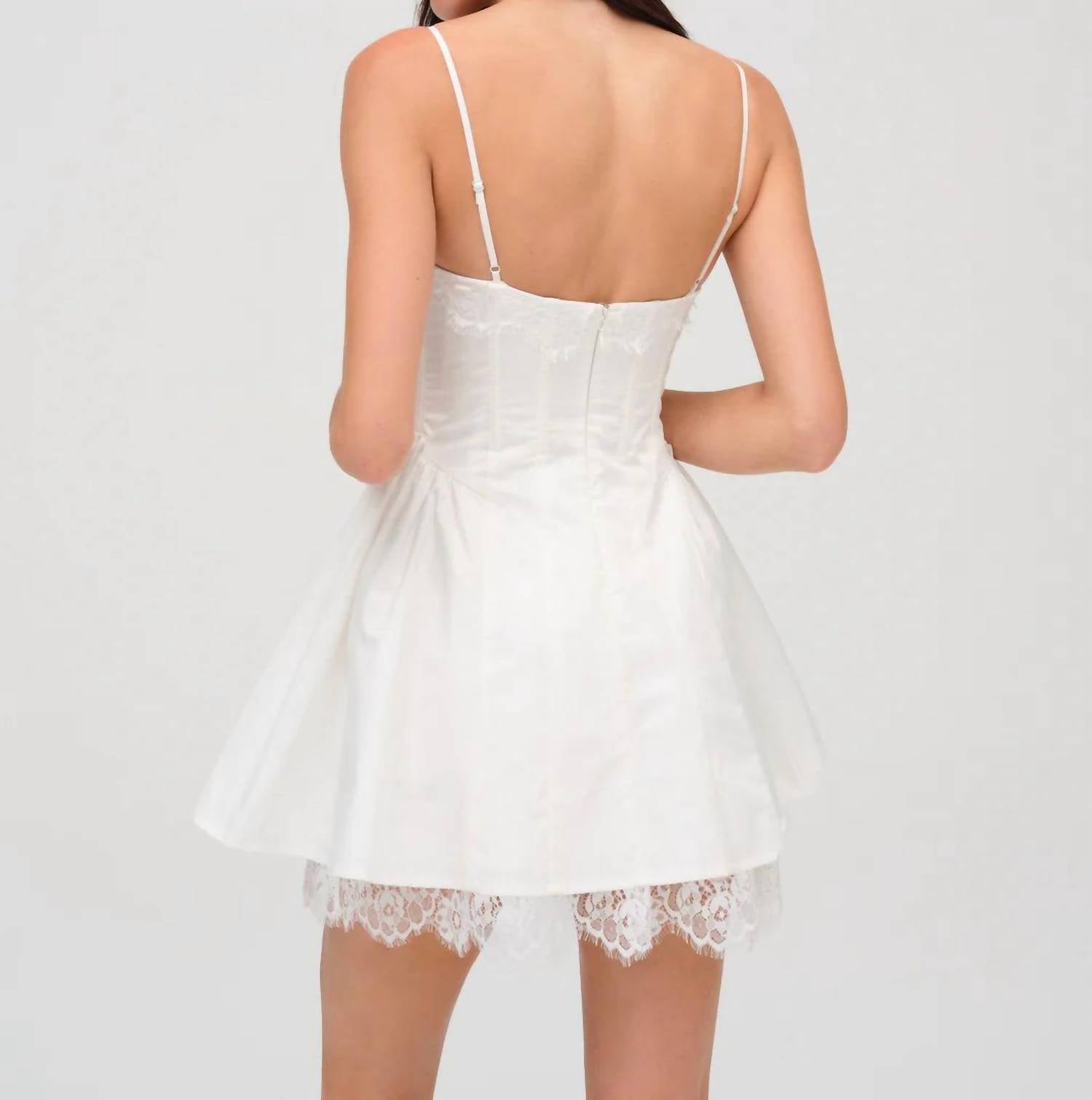 The perfect mini dress for those warmer months. Introducing the Shae Mini Dress by For Love & Lemons, a must-have for the spring season and beyond. This elegant white dress boasts spaghetti straps and lace detailing with a solid pattern, creating a minimalist yet sophisticated look. Crafted from 97% rayon with a contrast of 100% nylon and a lining of 100% cotton, it offers a fitted bodice with boning for structure and a flared skirt for a flattering fit-and-flare silhouette. The dress features an invisible zip closure at the center-back and requires dry cleaning to maintain its crisp poplin texture. Perfect for holiday parties, this dress combines elegance with comfort.