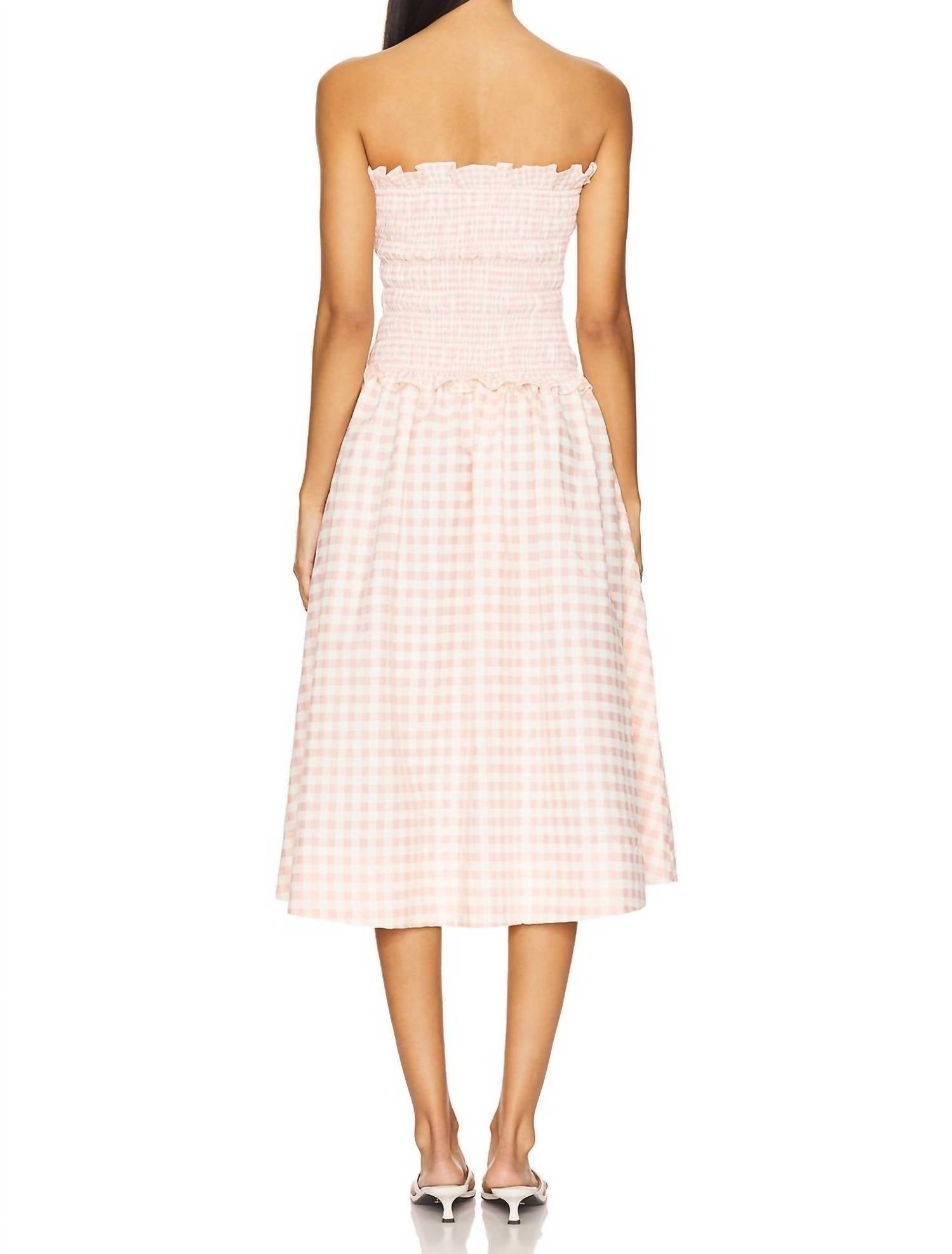 The perfect length dress does exist. Discover the Women's Petal Gingham Midi Dress by For Love & Lemons, a stunning Boho Chic piece perfect for summer vacations. This strapless dress in a charming peach gingham pattern features a fit and flare silhouette and a stylish squareneck neckline. The pull-on closure design ensures comfort and ease of wear. A perfect choice for those seeking a feminine and breezy look.