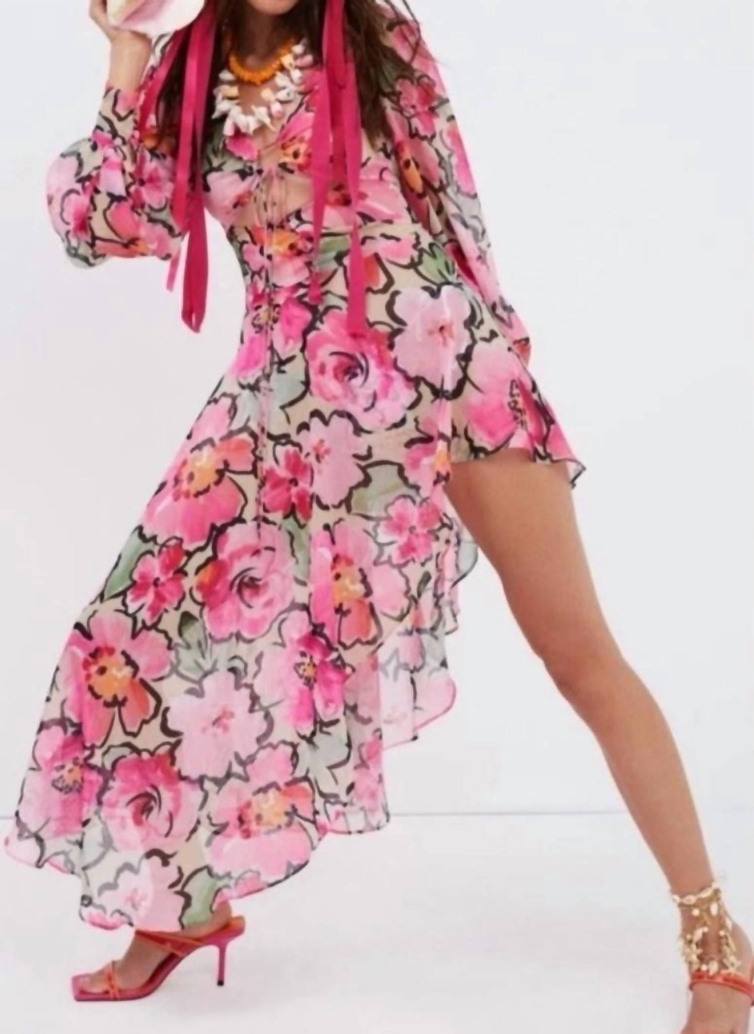 A midi dress so versatile, your options for wearing it are endless. Elevate your cocktail party ensemble with the Tiana Dress by For Love & Lemons, a stunning addition to your summer wardrobe. This elegant pink dress features long sleeves and a flattering scoopneck, accented with a floral pattern for a touch of maximalist flair. The A-line silhouette in a midi length gracefully complements the figure, while the convenient pull-on closure ensures a seamless fit. Perfect for your next event, this dress embodies chic sophistication.