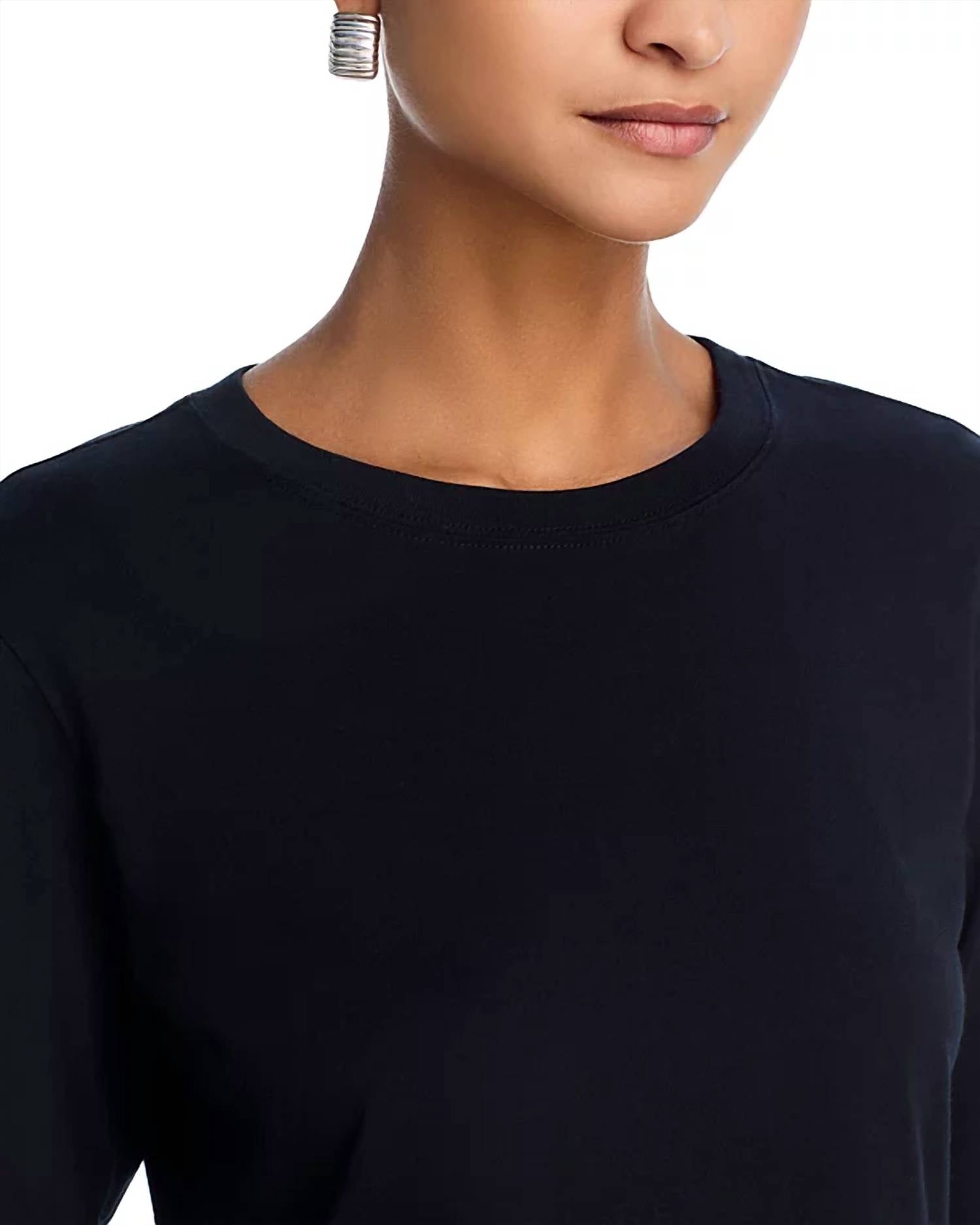 The perfect long sleeve tee that goes with just about anything. Introducing the FRAME Long Sleeve Baby Round Neck Top in sleek black, perfect for your vacation wardrobe. Made from 100% cotton, this solid, cropped tee features long sleeves and a crew neckline for a classic look. Imported with a convenient pull-on style, ensuring effortless wear. Care instructions suggest machine washing cold, inside out for long-lasting quality.