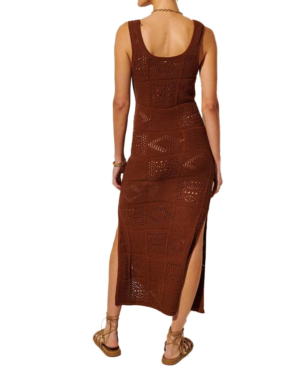 A midi dress so versatile, your options for wearing it are endless. Introducing the Clementine Knit Midi Tank Dress with Side Slit by KIVARI, a perfect blend of comfort and style for the modern woman. This sleeveless sheath dress is crafted from 100% cotton, featuring a scoop neckline and made in a rich brown hue. Its midi length and pull-on closure make it a versatile choice, effortlessly transitioning from day to night. Care for this elegant piece by dry cleaning only to maintain its sophisticated allure.