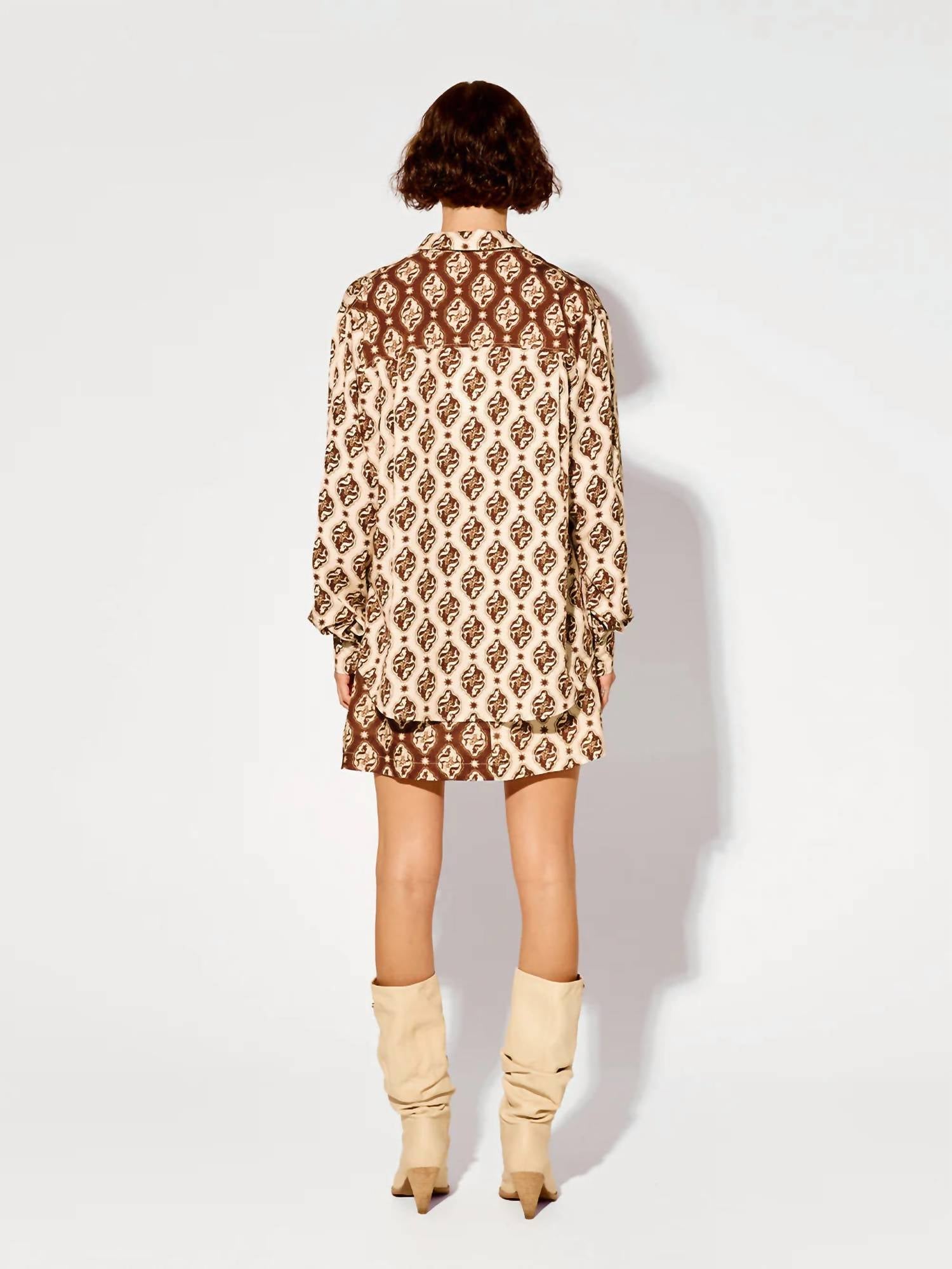 Perfectly tailored and soft to the touch. Elevate your wardrobe with the Melody Shirt by KIVARI, adorned in a captivating mermaid stamp print featuring chocolate and cream hues. This women's button-down shirt showcases full-length sleeves and a stylish V-neckline for a modern boho chic look. Closure: Button closure. Care: Dry clean. Perfect for spring occasions like Thanksgiving or an anniversary celebration.