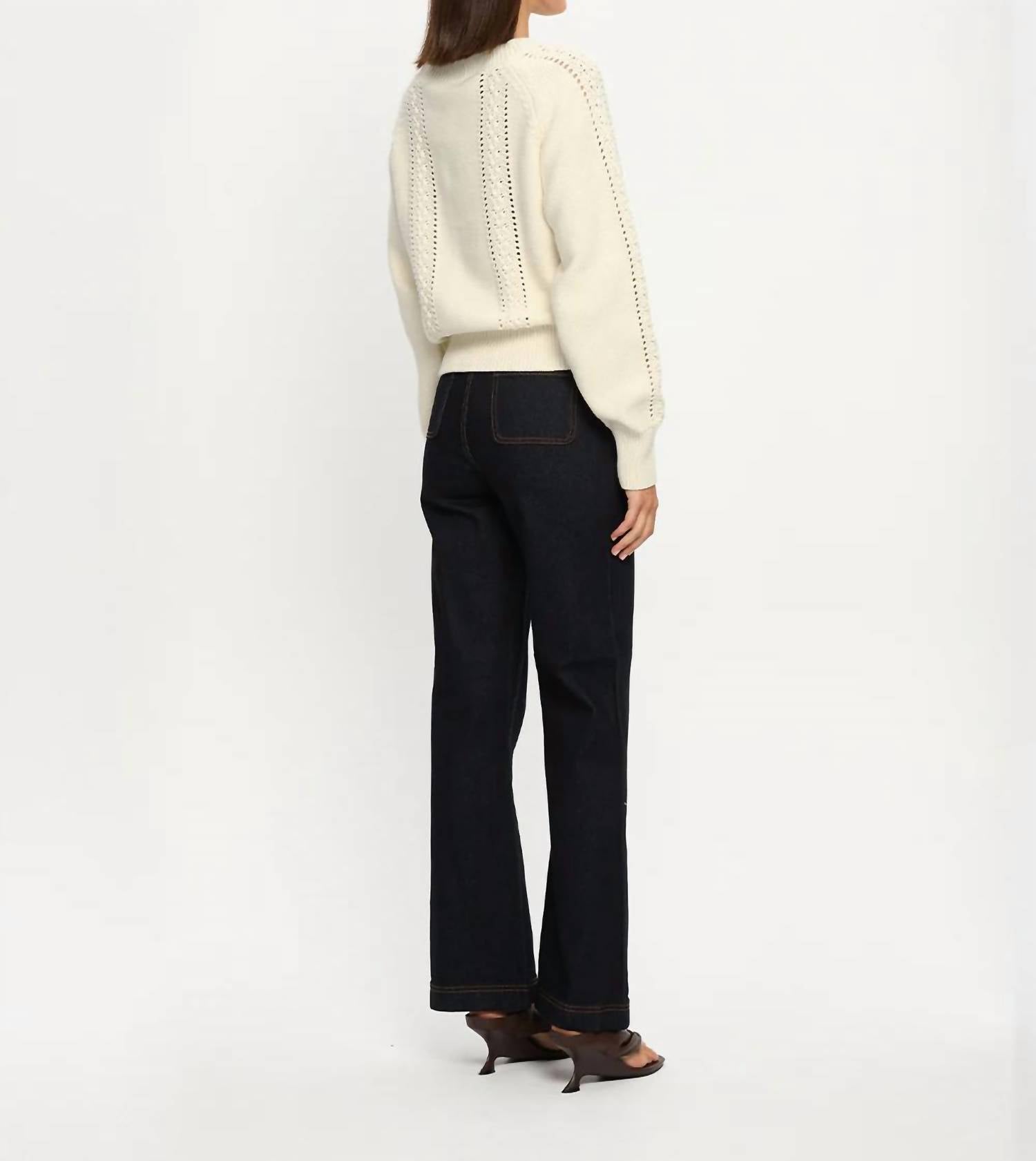 The ultimate go-to sweater, expertly crafted to provide the perfect combination of warmth and style. Its classic design and soft fabric make it a must-have addition to your wardrobe. Discover the Talia Knit Sweater by KIVARI, designed for comfort and style in a delicate cream hue. This relaxed-fit jumper features long raglan sleeves with fitted cuffs and a chic crew neck, accented by crochet knit stripe detailing. Crafted from 100% cotton, it measures 22.5 inches in garment length and offers a pull-on closure for easy wear. Care for it with hand wash and line dry instructions. Perfect for a minimalist winter travel wardrobe.
