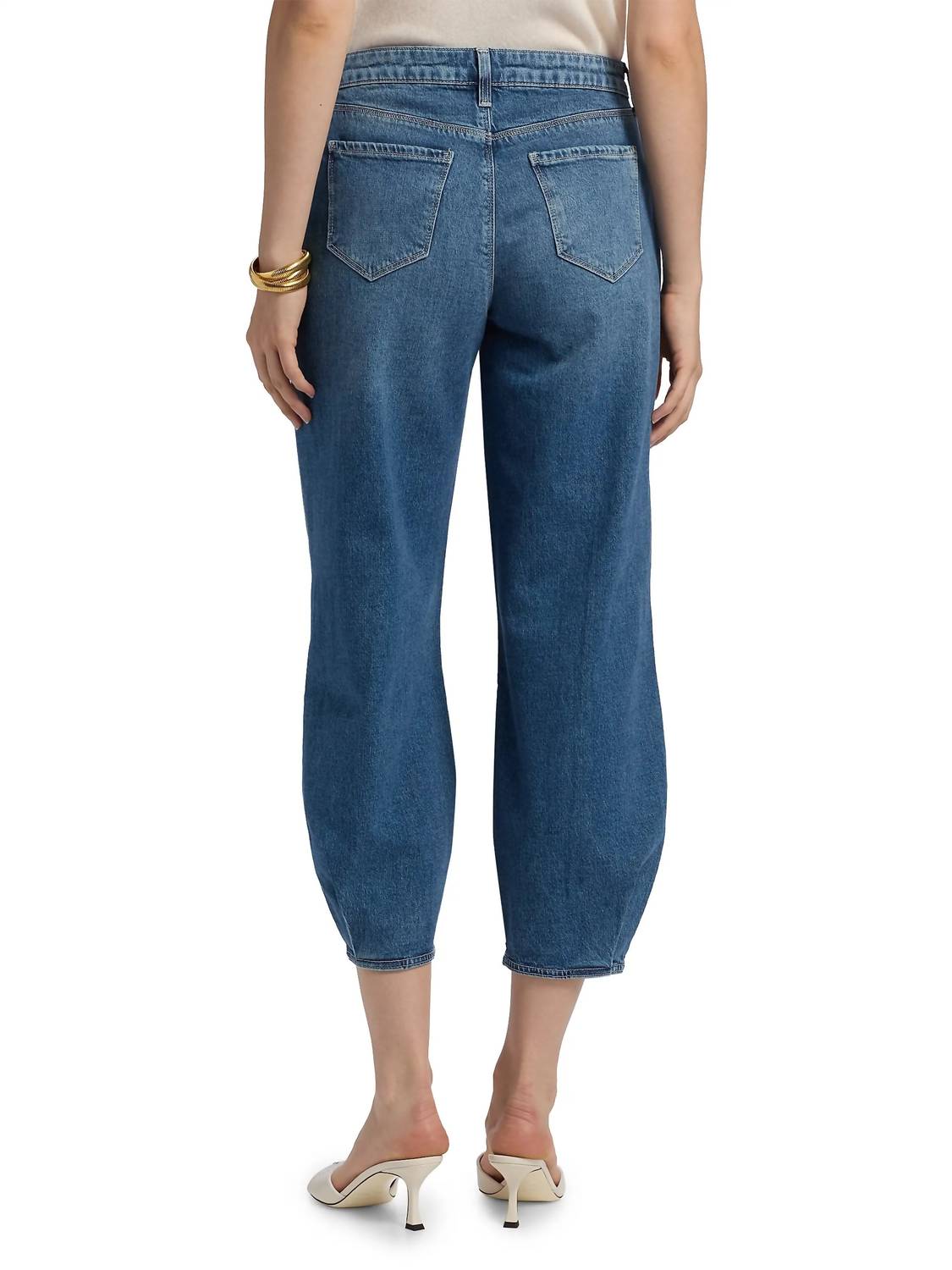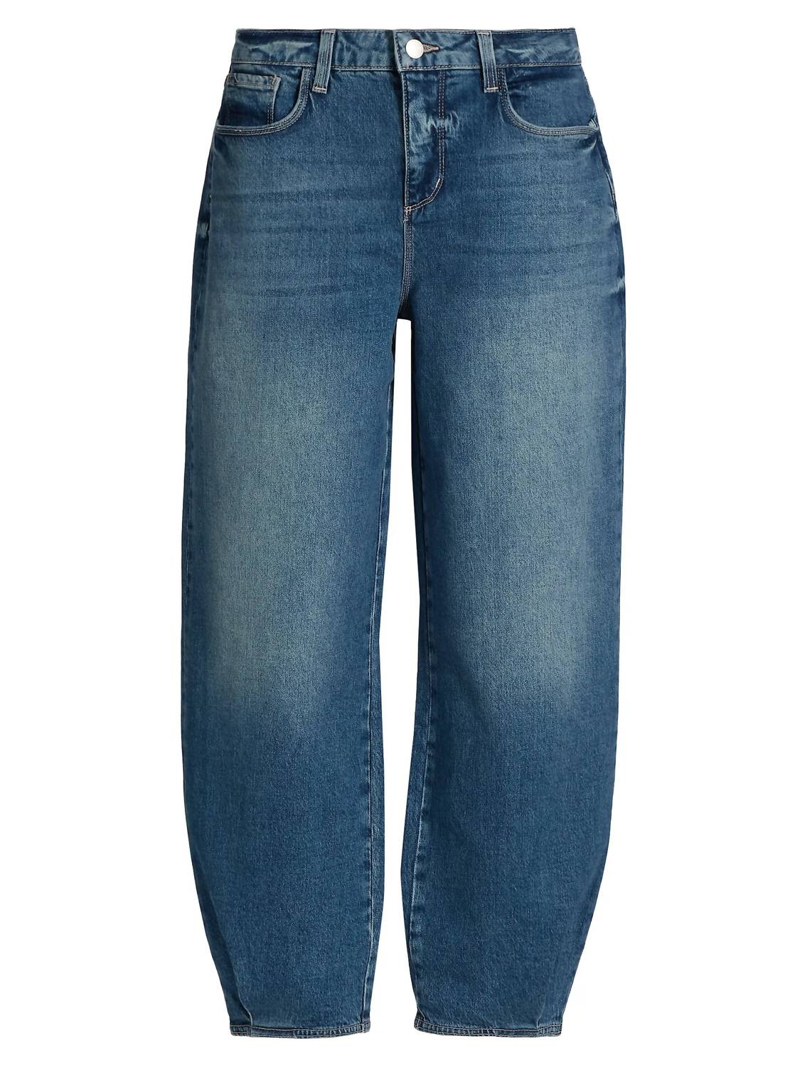 Pair these wide leg jeans with mules, slides or your favorite strappy sandals. Discover the Krista Tapered Jeans by L'Agence, a stylish selection in the striking Paladino shade. These high-rise jeans, crafted from a comfortable cotton blend, feature a relaxed fit with a classic stretch in a solid pattern. With a five-pocket construction, zip fly, and button closure, they offer both functionality and elegance. Ideal for summer streetwear, the medium wash jeans require dry cleaning for care.