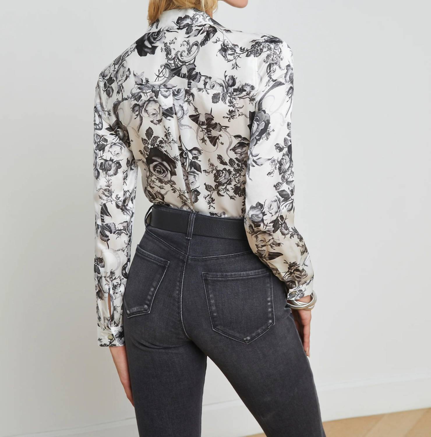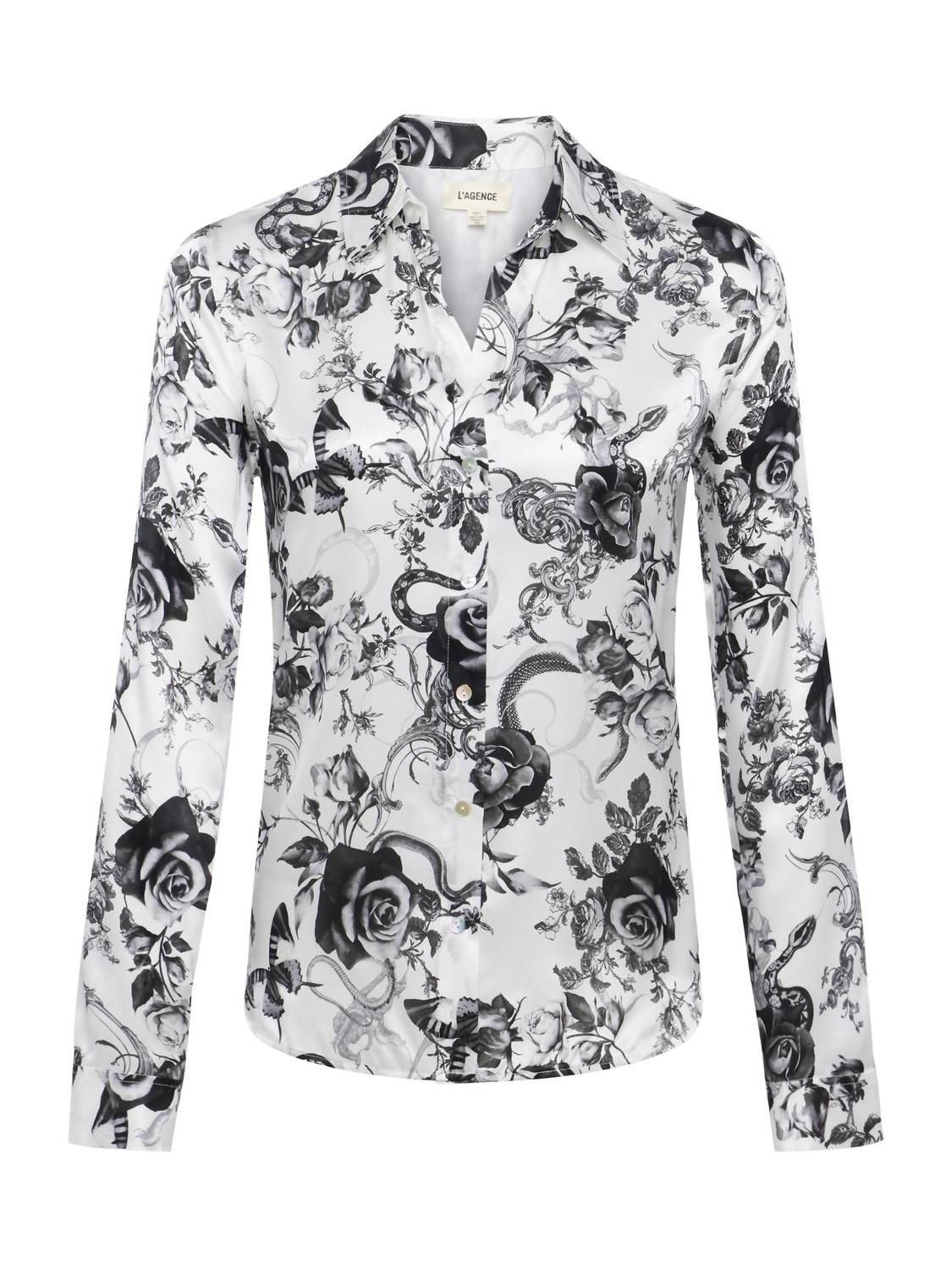 Pair this with your favorite jeans and slides for your next girls night out. Discover the Tyler Silk Blouse by L'Agence, a timeless piece in a captivating white and black baroque floral print. This blouse features long sleeves with a pleated yoke, perfect for adding a touch of elegance to any outfit. Composed of 100% silk charmeuse, it offers a luxurious feel, and its button closure adds classic detail. For care, machine wash is recommended. This versatile piece seamlessly fits into spring wardrobes, particularly ideal for minimalist looks and occasions like a baby shower.