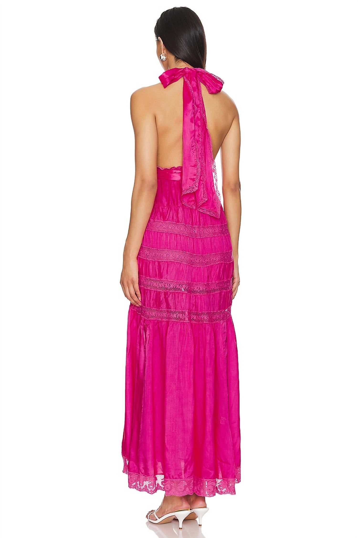 Who doesn't love a good maxi dress? This one you'll be reaching for season after season. Step into nostalgic elegance with the LoveShackFancy Vendima Halter Dress, a stunning summer maxi in vibrant fuchsia glow. This sleeveless dress is crafted from luxurious viscose, showcasing a textured pattern in a flattering A-line silhouette. Designed with a chic V-neckline, it features a convenient tie closure for a personalized fit. Care for this vacation-perfect piece by dry cleaning only.