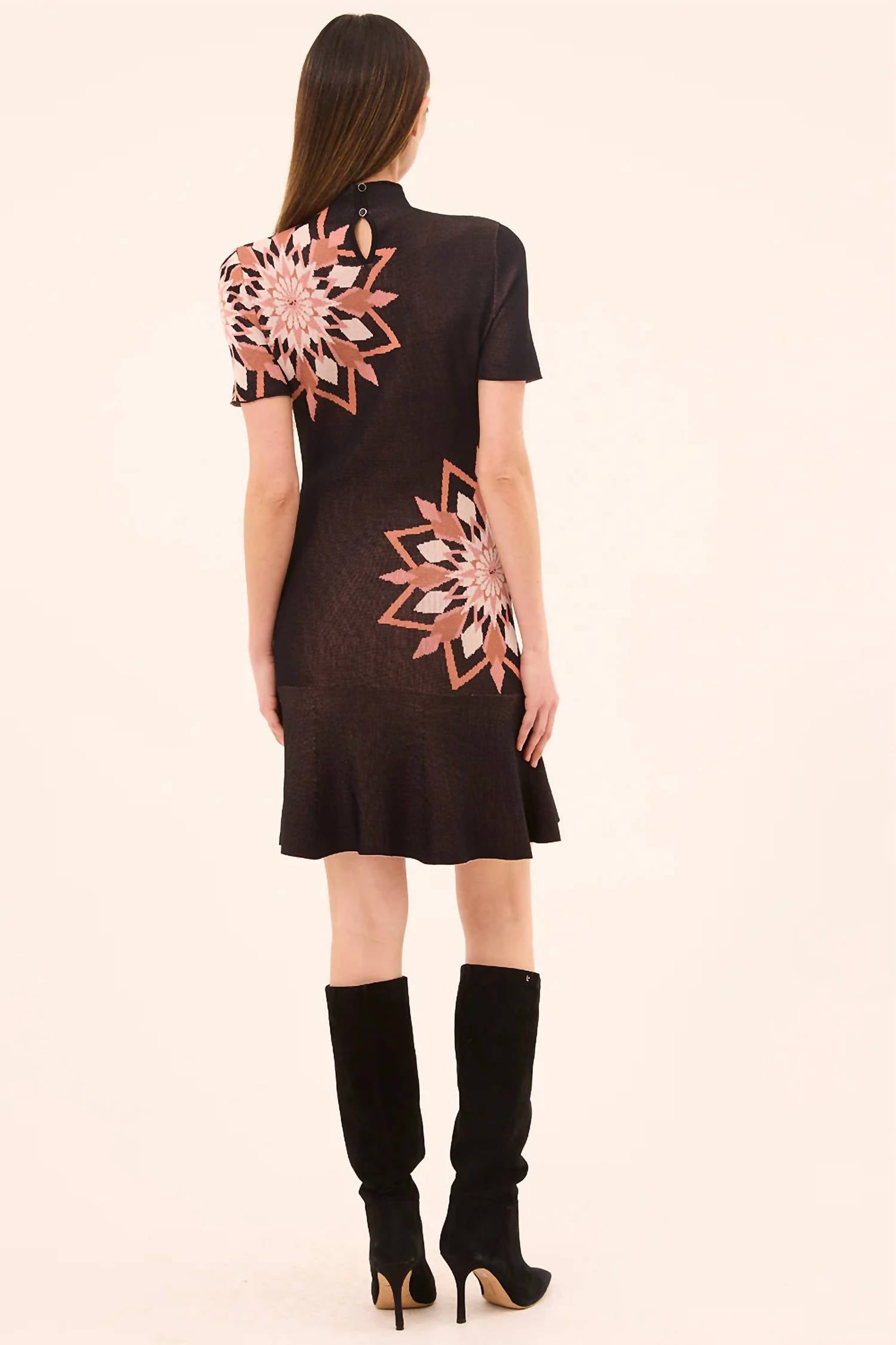 The kind of easy and flattering dress you'll be reaching for all season long. Introducing the Allie Mini Dress by Misa Los Angeles, a vibrant piece featuring a Moroccan Snowflake jacquard pattern. This women's dress boasts short sleeves and a mock turtleneck, offering a playful yet elegant look with its fit-and-flare silhouette, drop waist, and ruffle hem. Crafted from a blend of 80% Viscose and 20% Nylon, it promises comfort and style, making it an ideal choice for holiday parties and transitioning into the cooler seasons. Closure is conveniently pull-on, and caring for it is simple with hand wash and laying flat to dry. The model, with measurements of 5'8.5" height, 25" waist, 32" bust, and 34.5" hips, is wearing a size XS.