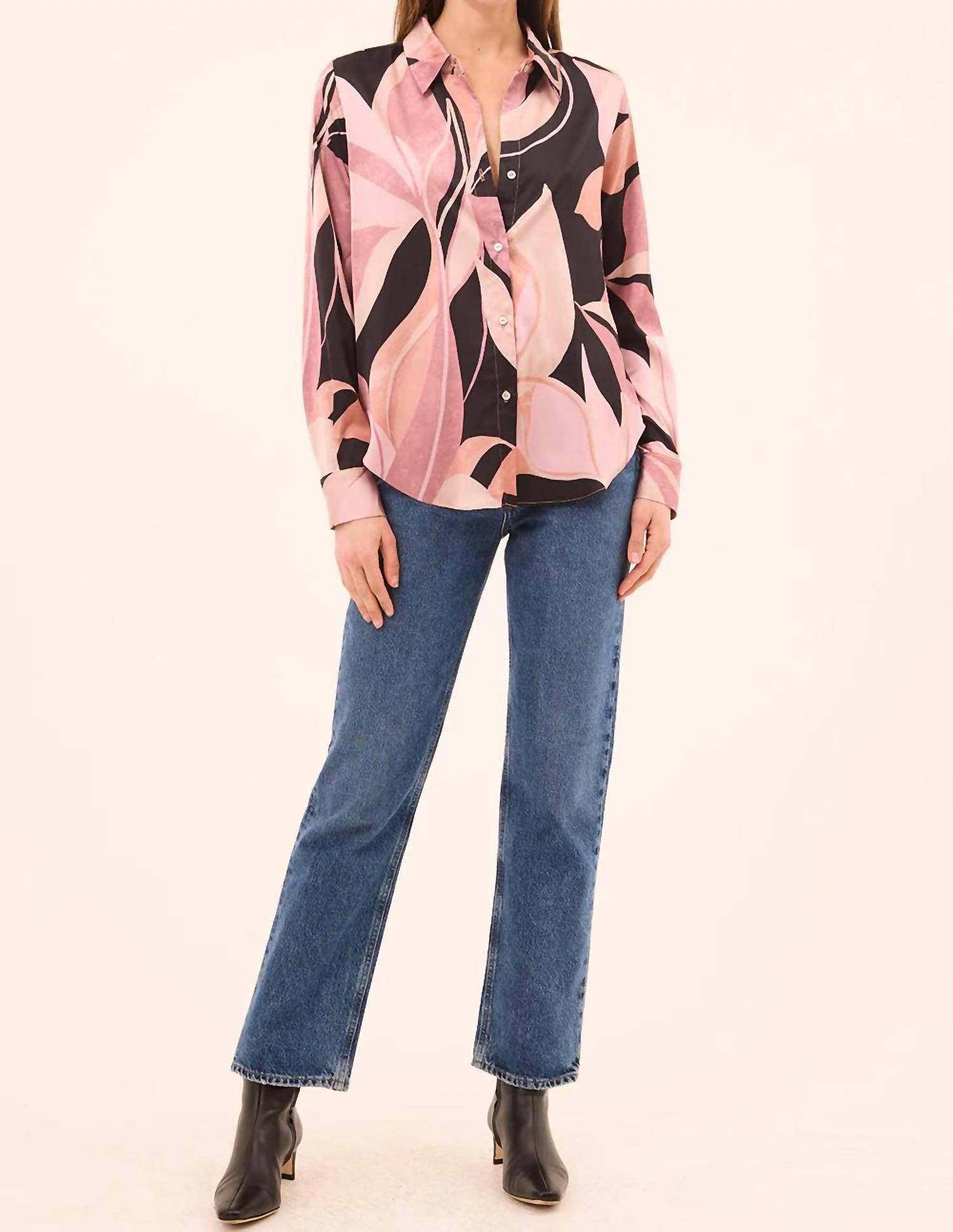 A classic button down shirt that will never go out of style. The Celine Button Shirt Top is made of 100% polyester satin with a Moody Abstract Flora print. It features a classic fold-over collar and pearlized buttons. The top is made in the USA and requires dry cleaning. The model, who is 5'8.5" tall with a 25" waist, 32" bust, and 34.5" hips, wears size XS.