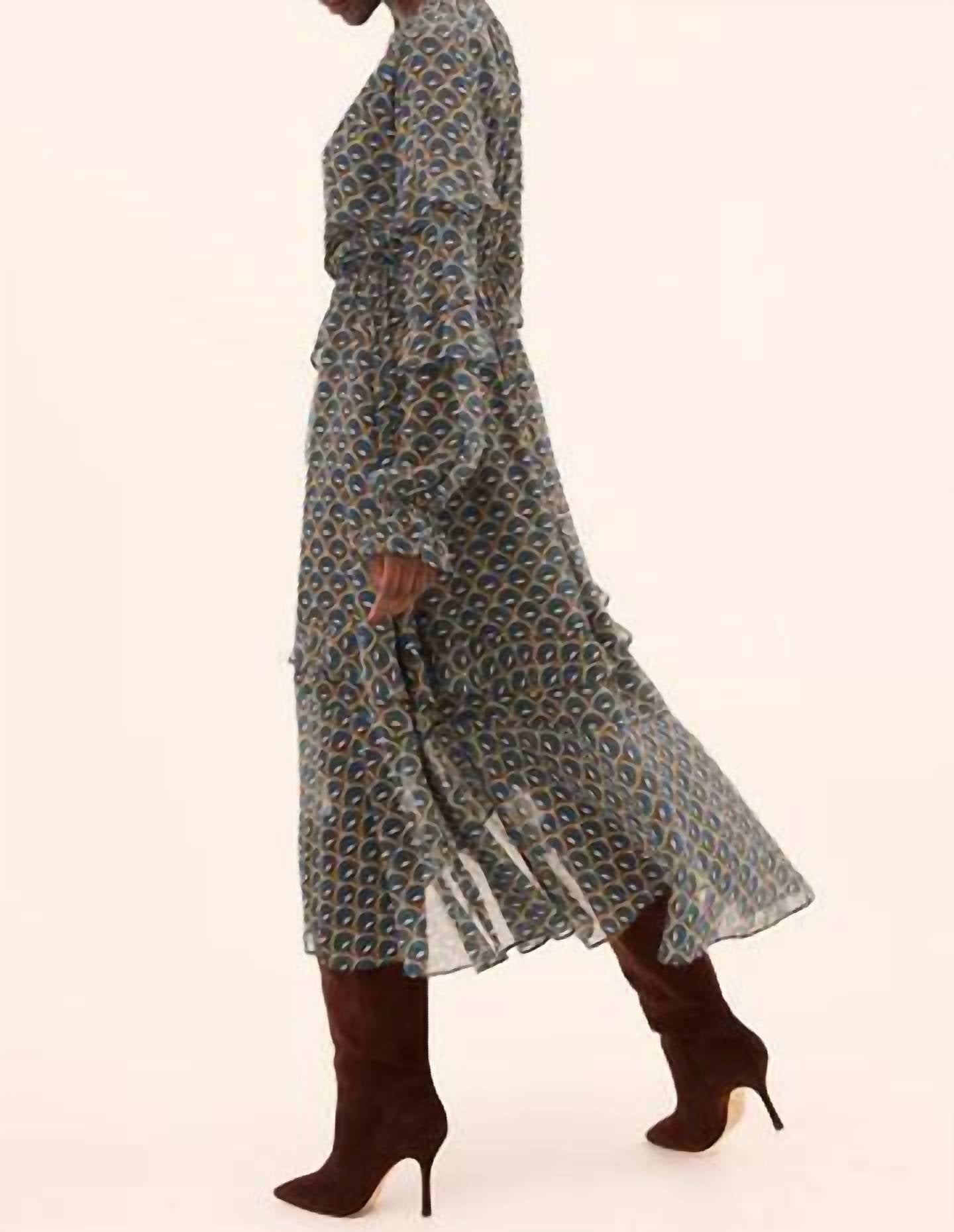 Just add slides or mules and you are good to go. Introducing the Delora Midi Dress by Misa Los Angeles, a bohemian dream in Dandelions Chiffon perfect for fall occasions. This patterned dress with long blouson sleeves and elasticated ruffle cuffs exudes elegance with its deep crossover V-neckline and elasticated waist, enhancing the A-line silhouette. Made from 100% Poly Chiffon, it features an asymmetrical skirt with staggered crossover ruffles, partially lined to the knee. Crafted in the USA, this ensemble should be dry cleaned to maintain its airy charm.