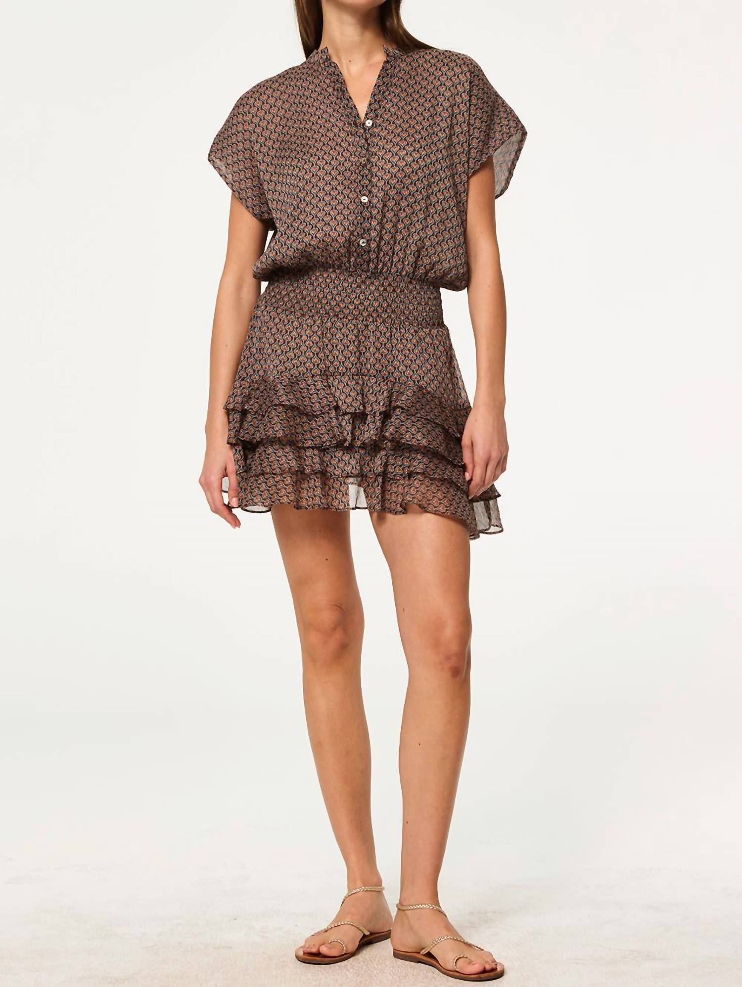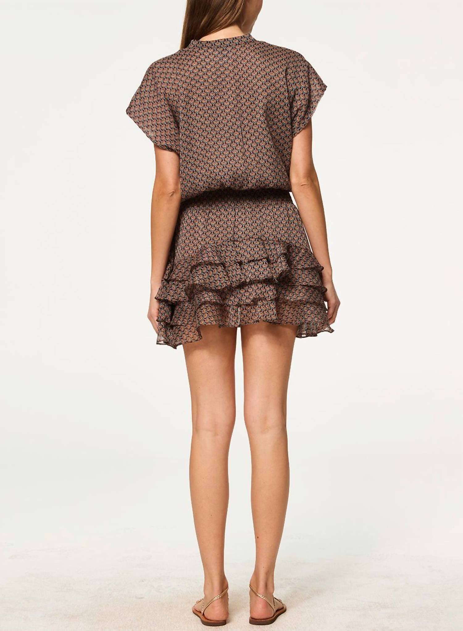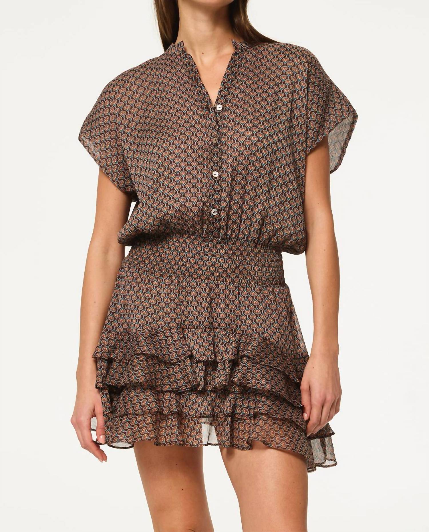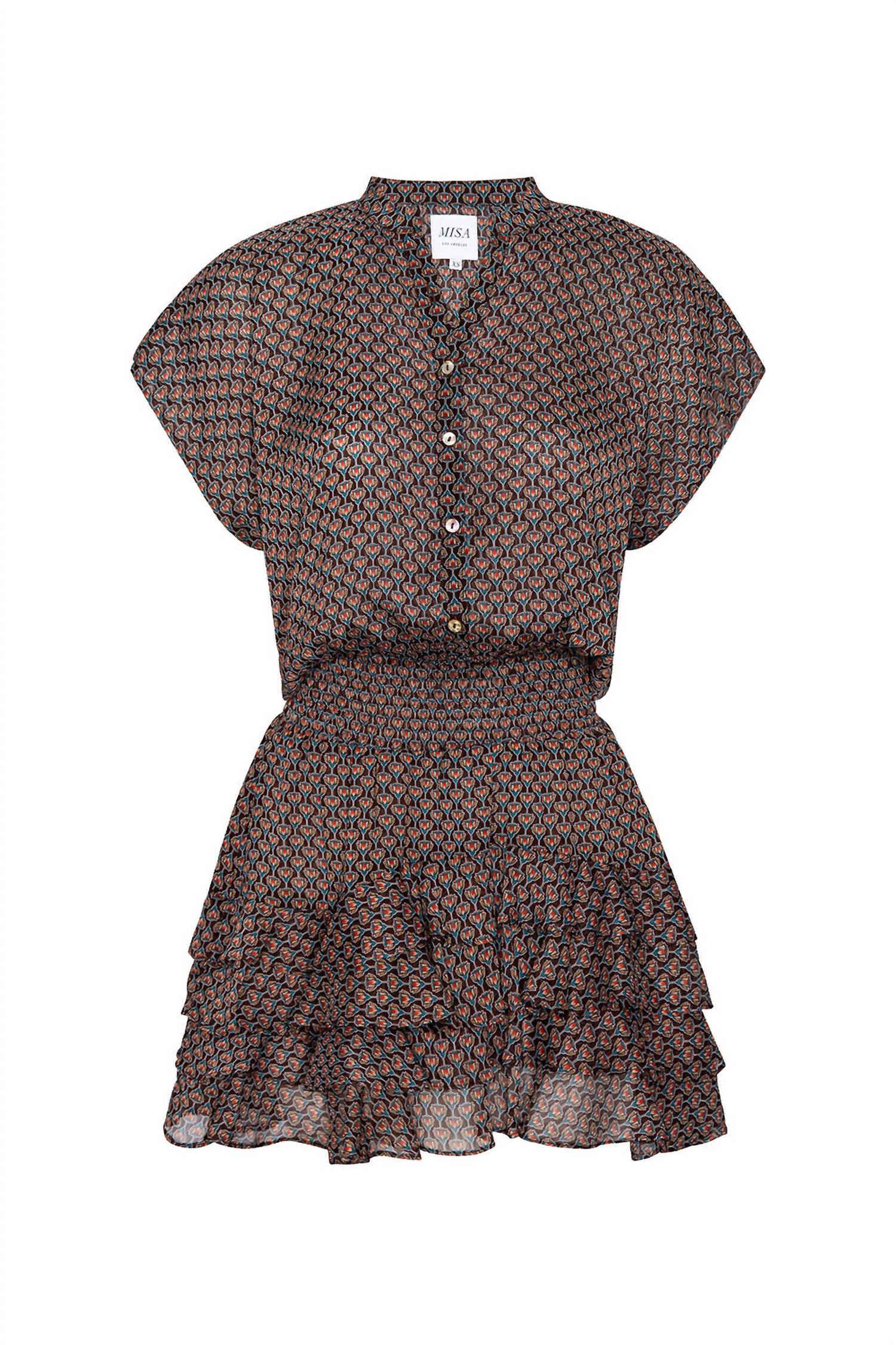 A cool twist on a classic style dress. Introducing the Evie Paisley Dress by Misa Los Angeles, a charming mini dress perfect for summer fashion. This A-line dress is made from 100% poly chiffon and showcases a delightful brown paisley pattern. Expertly crafted in the USA, it features a double-lined button-down bodice with a V-neckline, a flattering smocked elastic waist, and tiered asymmetrical ruffle hem for a touch of elegance. Closure: Button closure. Model is 5'8.5" and wears a size XS (Bust 32", Waist 25", Hips 34.5").
