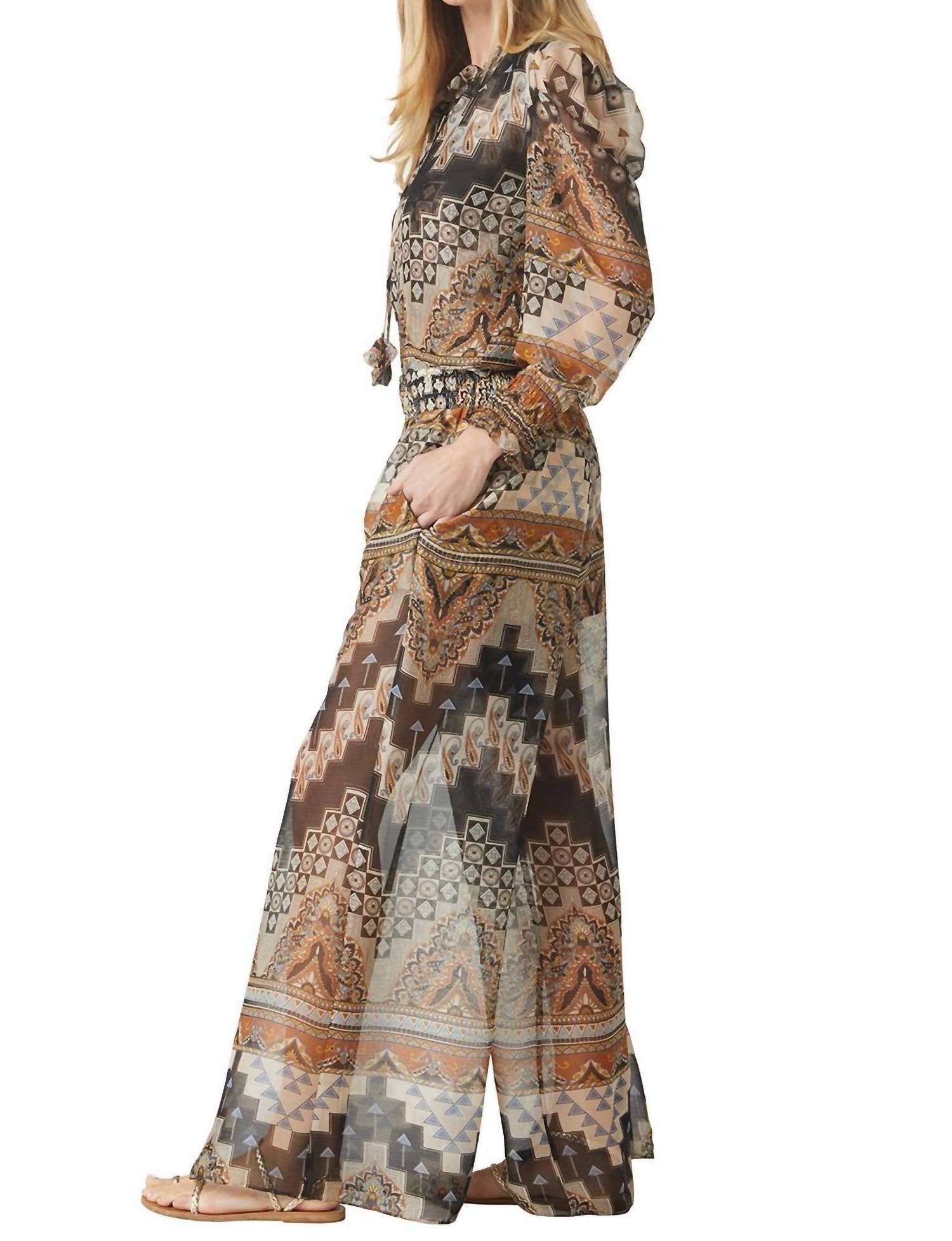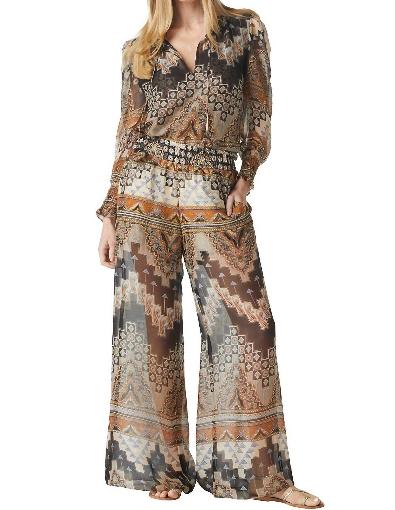 A timeless blouse that will never go out of style. A classic top in a mosaic print chiffon. A split-tie neckline with ruffle trim and petal ties lead into long semi-sheer sleeves with wide, smocked elastic cuffs. 100% Poly Chiffon. Made in the USA. Dry Clean.