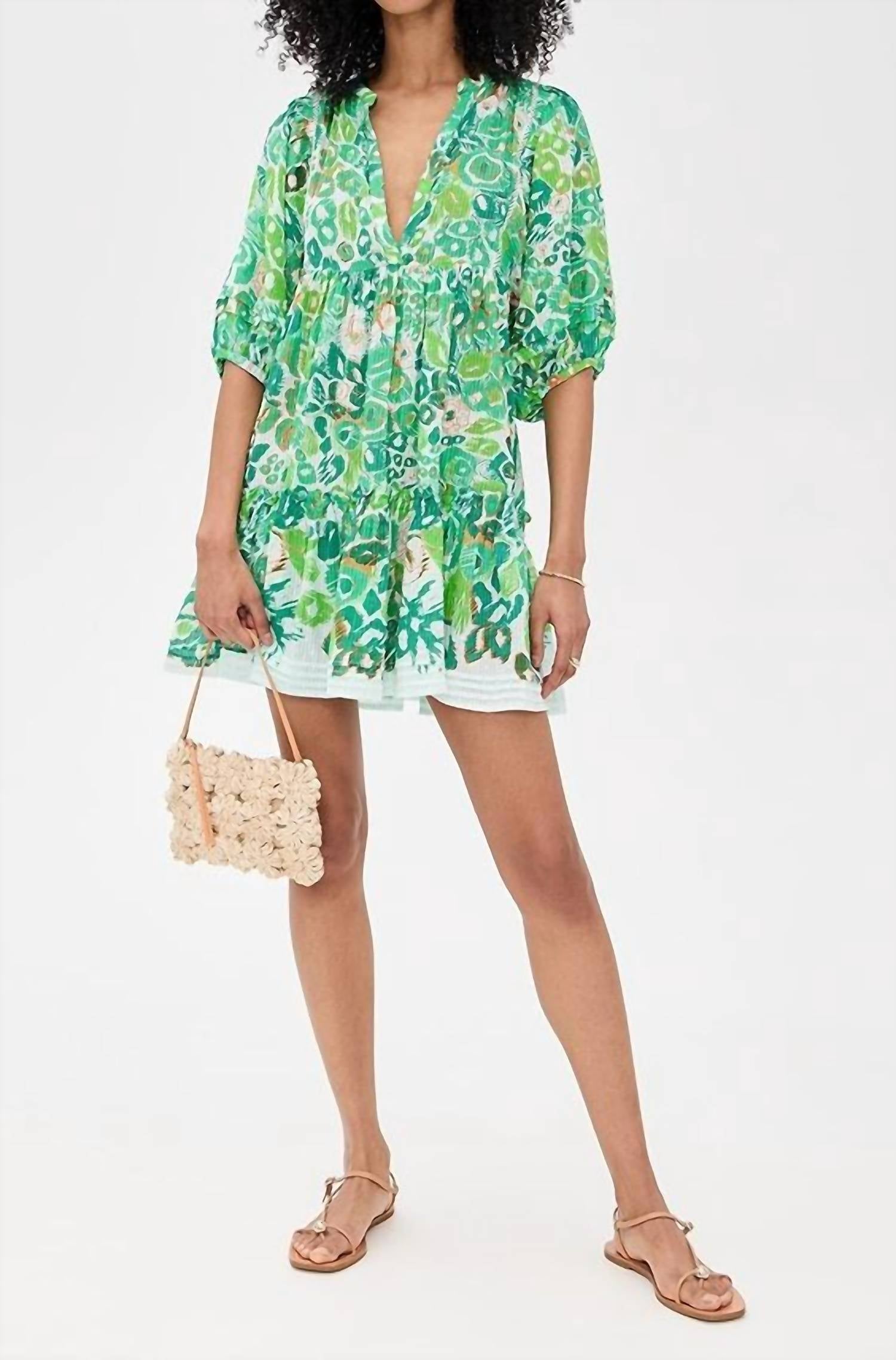 A short and breezy dress for those warmer days. Elevate your wardrobe with the Aria Mini Dress by Poupette St Barth, crafted from 100% cotton for a comfortable fit. This patterned dress features elbow-length puff sleeves with elastic cuffs and a charming tiered skirt. Designed in a classic Black Victorian hue, it boasts a chic V-neckline and effortless pull-on style. Perfect for any occasion, this mini dress blends style and comfort seamlessly.