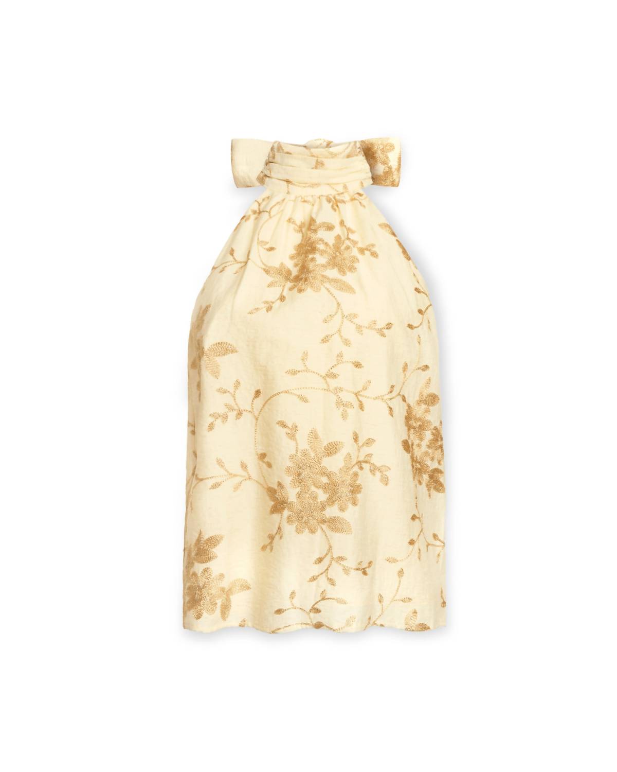The perfect tank top for those warmer weather seasons. Elevate your style with the Cara Metallic Embroidered High-neck Tank by Ramy Brook, a perfect choice for any holiday party. This sleeveless tank features an exquisite Lurex floral embroidered detail on a luxurious 67% Rayon 21% Nylon 12% Linen blend in ivory. Designed with a full-length, non-banded silhouette and halter neckline, it ensures a relaxed fit and strapless bra compatibility. Closure: Tie back. Care: Dry clean or hand wash. Model is wearing size XS and stands at 5'9".