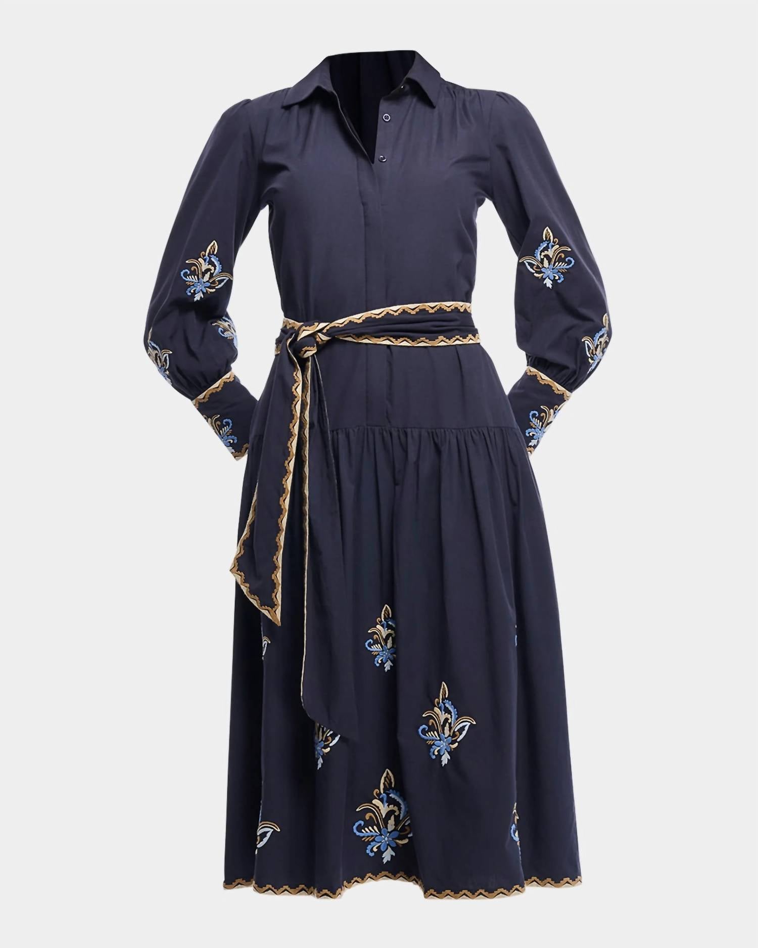 A midi dress so versatile, your options for wearing it are endless. The Shoshanna "Greer" midi shirtdress features floral and geometric embroidery with a point collar, concealed button front, and bracelet sleeves with button cuffs. It has a ruched back yoke, waist self-tie, on-seam pockets, and an A-line silhouette with a hem that falls below the knee. The dress measures approximately 50.5 inches from shoulders to hem, is made of cotton, requires dry cleaning, and is imported.